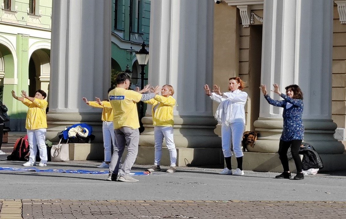 本次参加弘法活动的学员德扬(Dejan)分享道,他们这是第二次来这里了,他在大法中修炼十八年。回忆十八年前,他就是接到了法轮功学员递给他的一份真相资料。当时他并没有马上学炼,后来因为妻子得了癌症,才想起来法轮功学员给的资料。后来,他们夫妻一块学炼法轮功,身体越来越舒服,上医院检查,妻子的肿瘤不翼而飞了。从此德扬一直修炼到今天。