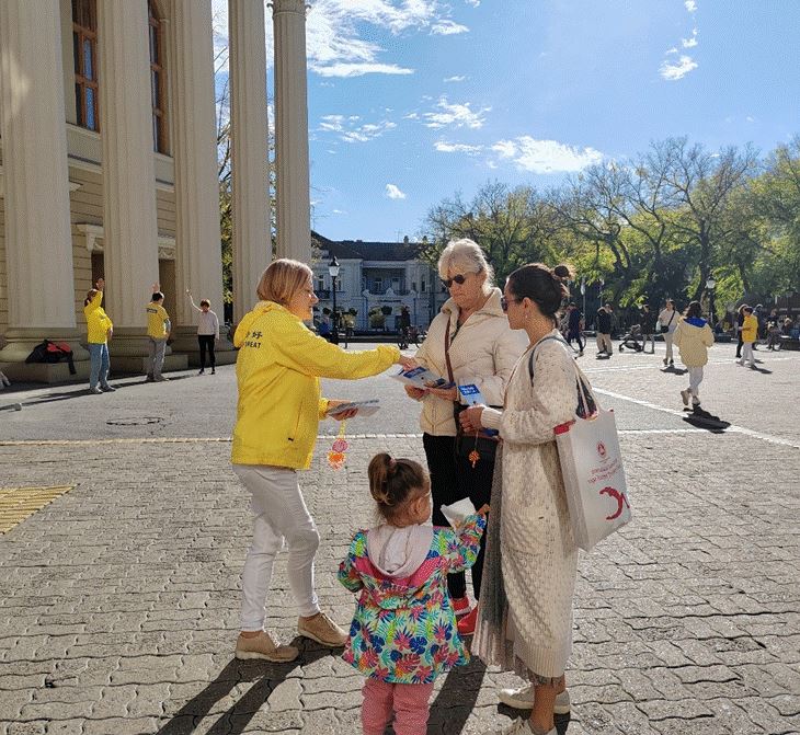 本来这里正是秋冬交季的时节,活动当天蓝天白云,秋光明媚。学员向市民及游客展示功法传,递法轮大法的美好,受到人们的喜爱和欢迎,有的表示当下就想学炼功法。