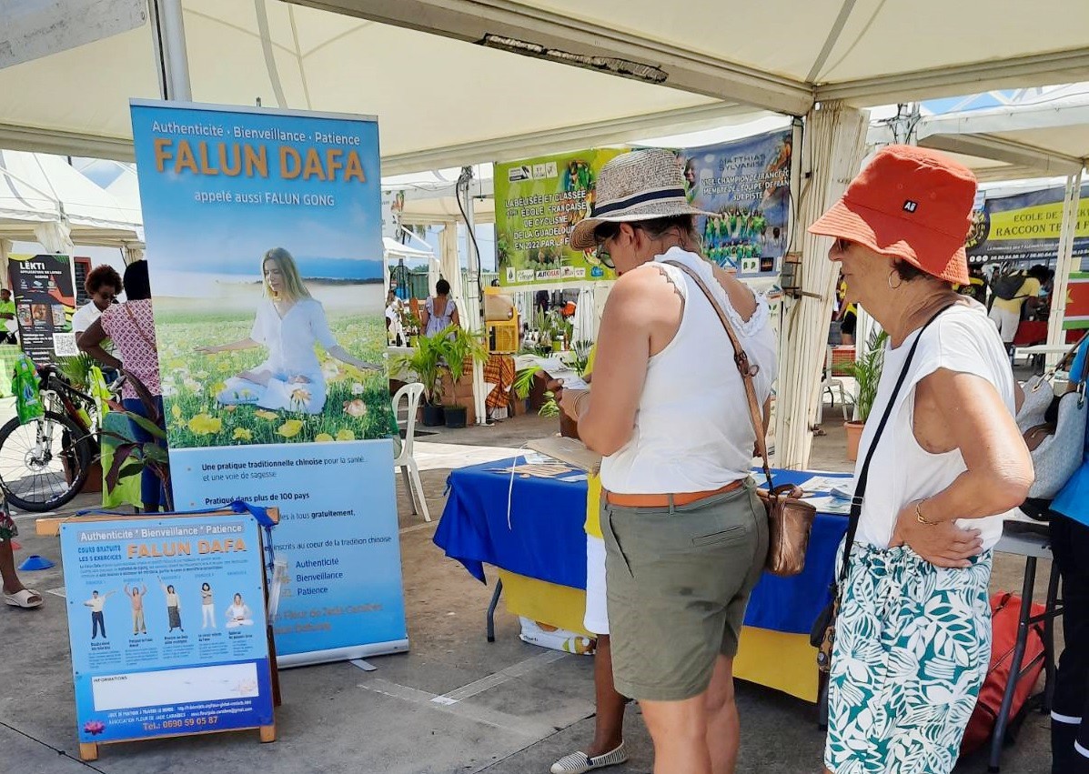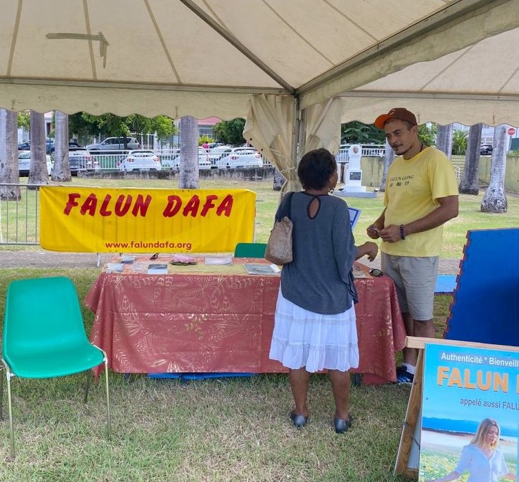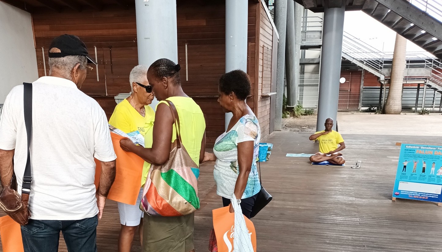 有位学员是一名教师,她向学生的家长以及学校的同事介绍法轮功。其中一人几年前就已经了解真相。这次他和太太来到了法轮功展位,询问炼功点的地址,学员告诉这对夫妻,巴塞-泰尔的炼功点设在市中心的海港滨海大道上。在接下来的一周里,这对夫妇来到炼功点学炼了法轮功五套功法。