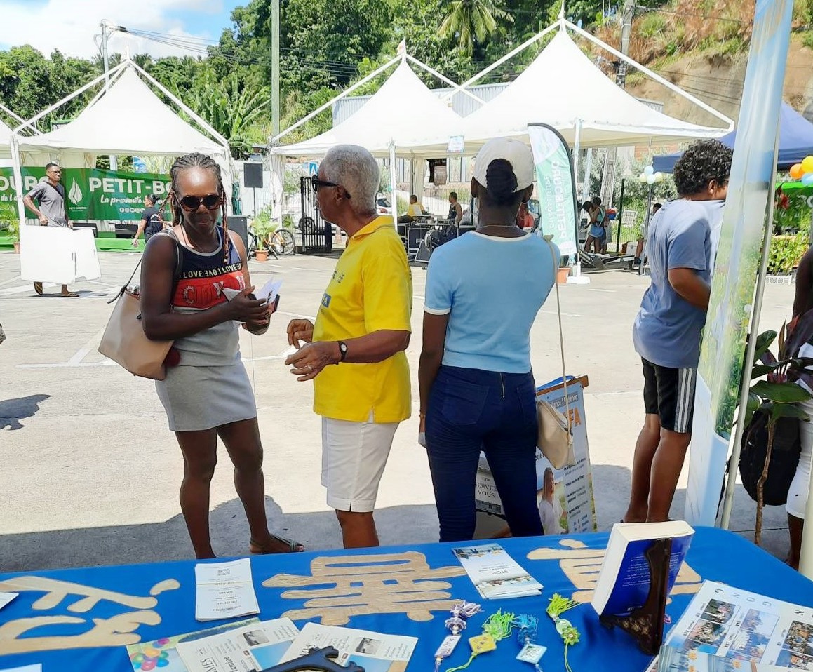 九月十六日星期六,在瓜德罗普岛首府巴斯-泰尔(Basse-Terre)的阿尔博广场(Champ d'Arbaud)的协会节上,法轮功学员向当地居民介绍法轮大法。