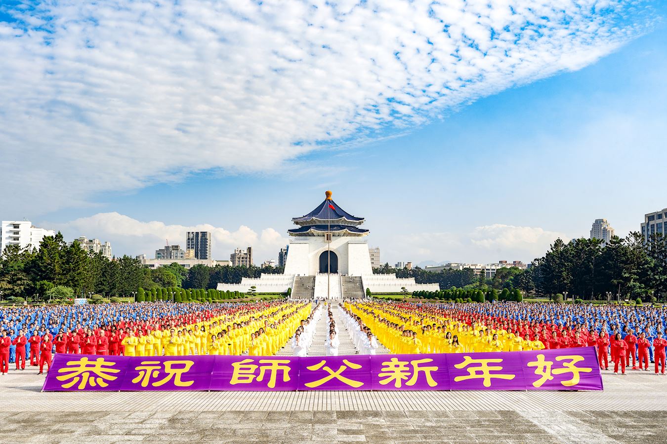 当天晴空万里,学员们有序入座,场面平静、祥和、壮观,吸引了许多民众、国内外旅客驻足。排字结束后,学员们举行集体炼功,并拉起「法轮大法好」、「师恩浩荡」「谢谢师父」等横幅,表达对大法及李洪志师父的感谢,最后,后整个活动在学员们齐声敬颂「恭祝师父新年好」的声音中画下句点。