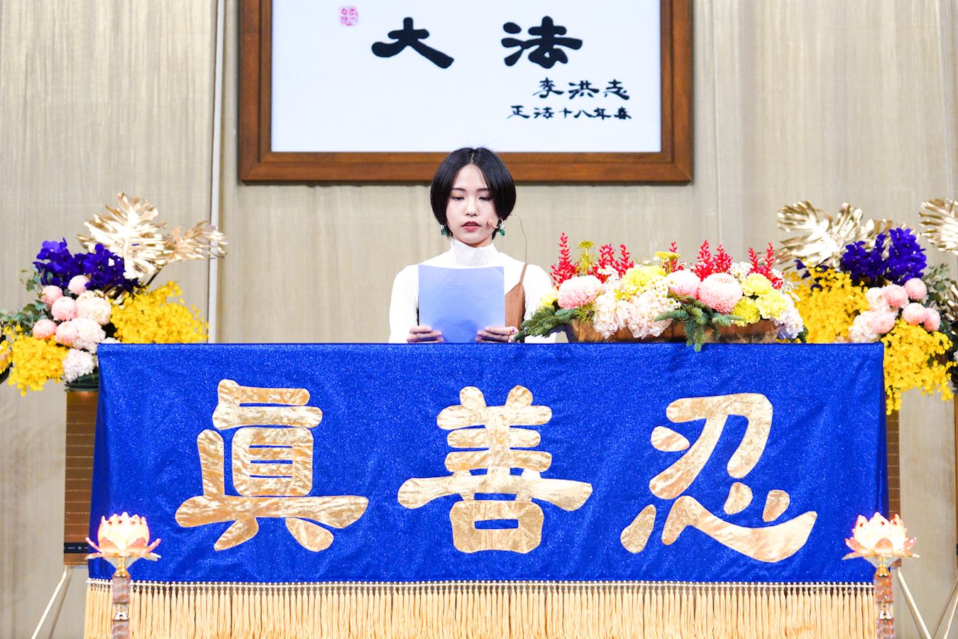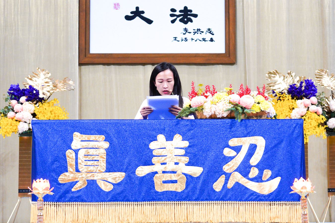从军职退伍的学员倩玉,在法会上分享她在军中向两百多位高阶长官讲清法轮大法真相的心得。