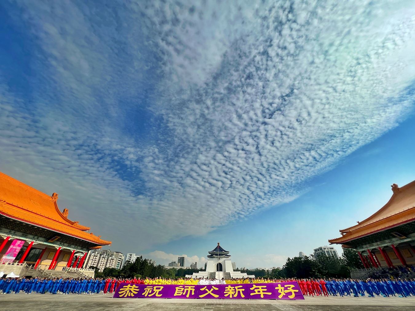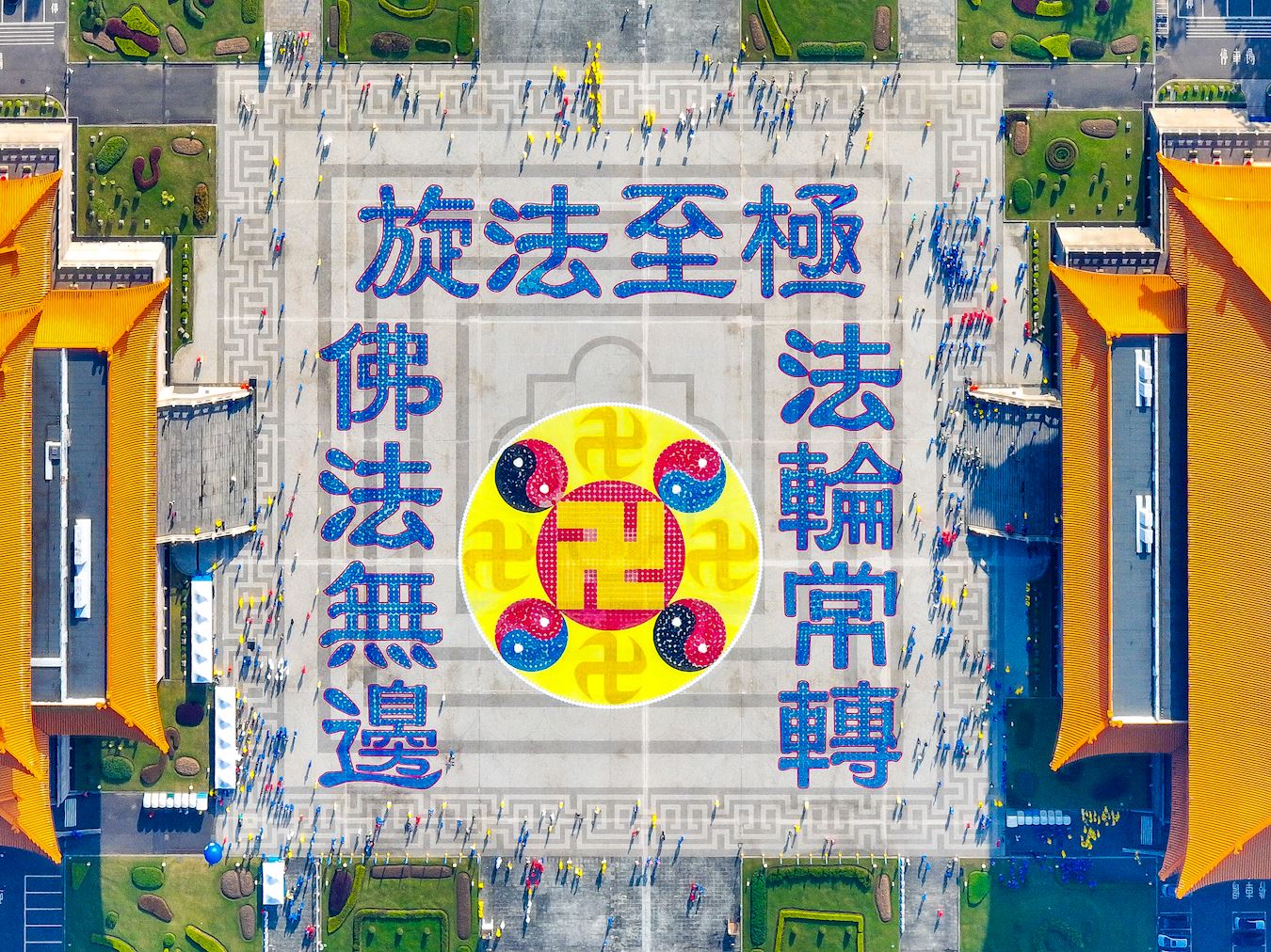 ![]() 图1:法轮功学员在台北中正纪念堂自由广场排出殊胜的及“旋法至极 佛法无边 法轮常转”隶书体字样。 |