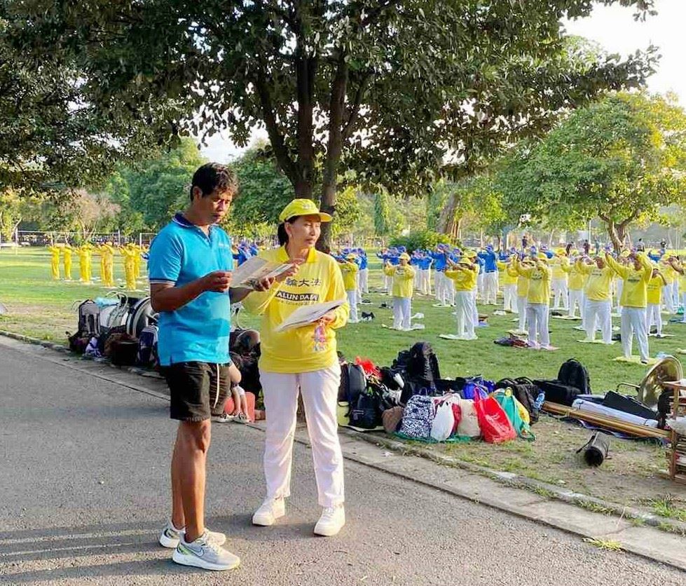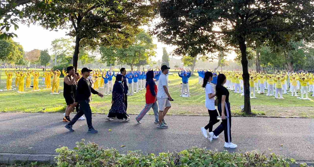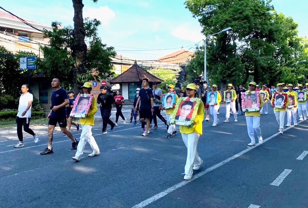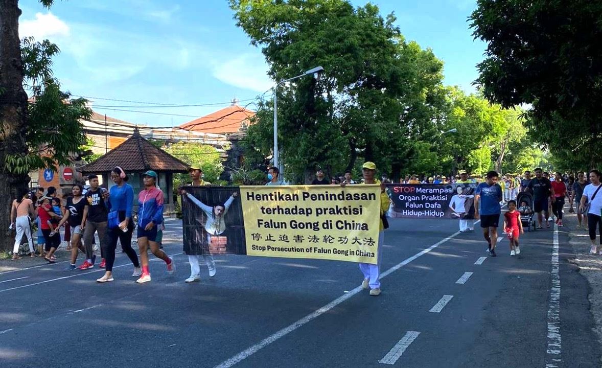 晨曦,法轮功学员以集体炼功开启当天的弘法活动,学员们展开真相横幅及展板向人们讲述法轮功的真相,并征集请愿签名。此外,学员也举行环绕瑞能广场(Lapangan Renon)行程为三公里的游行,揭露中共对法轮功长达二十四年的迫害。