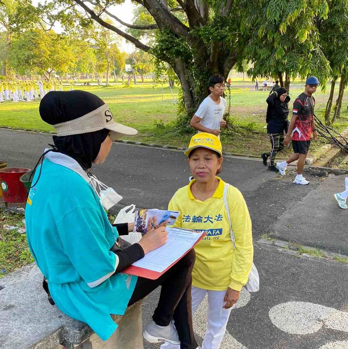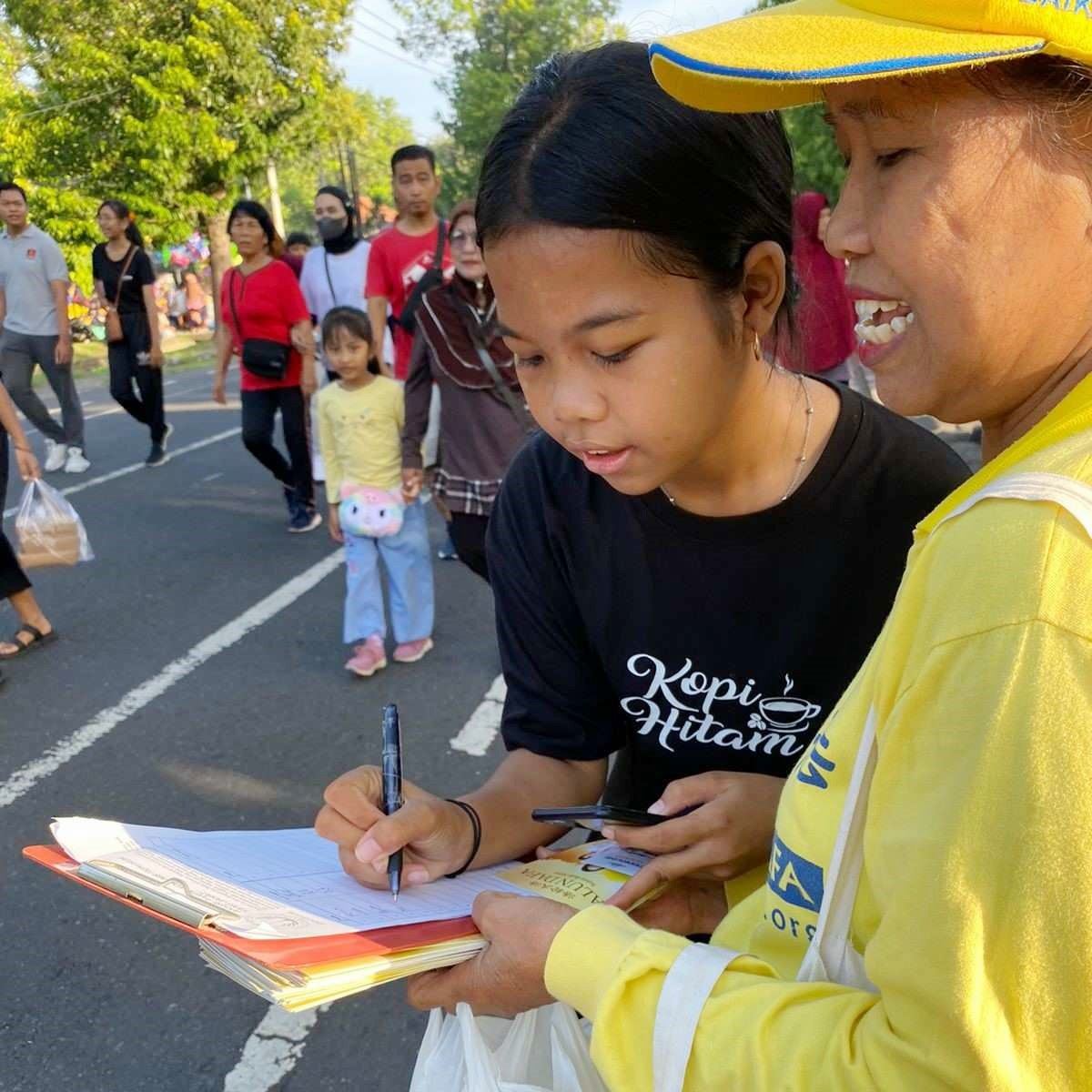 一名叫微蒂亚(Widya)年轻女孩告诉学员说:“你们看起来很祥和,我觉得我必须支持你们共同制止这场迫害。”微蒂亚签名之后,站在一旁的朋友也跟着签名支持反迫害的请愿。许多人也都签名,并且希望这场迫害即刻停止。一名男士向学员说:“人权迫害不管在哪里都必须停止。”