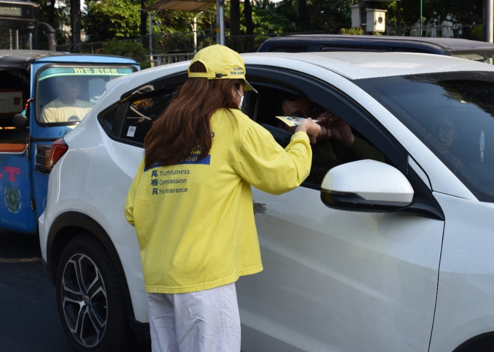 路过的许多汽车和摩托车都放慢车速阅读横幅上所写的讯息,并且接收学员所传递的真相传单。