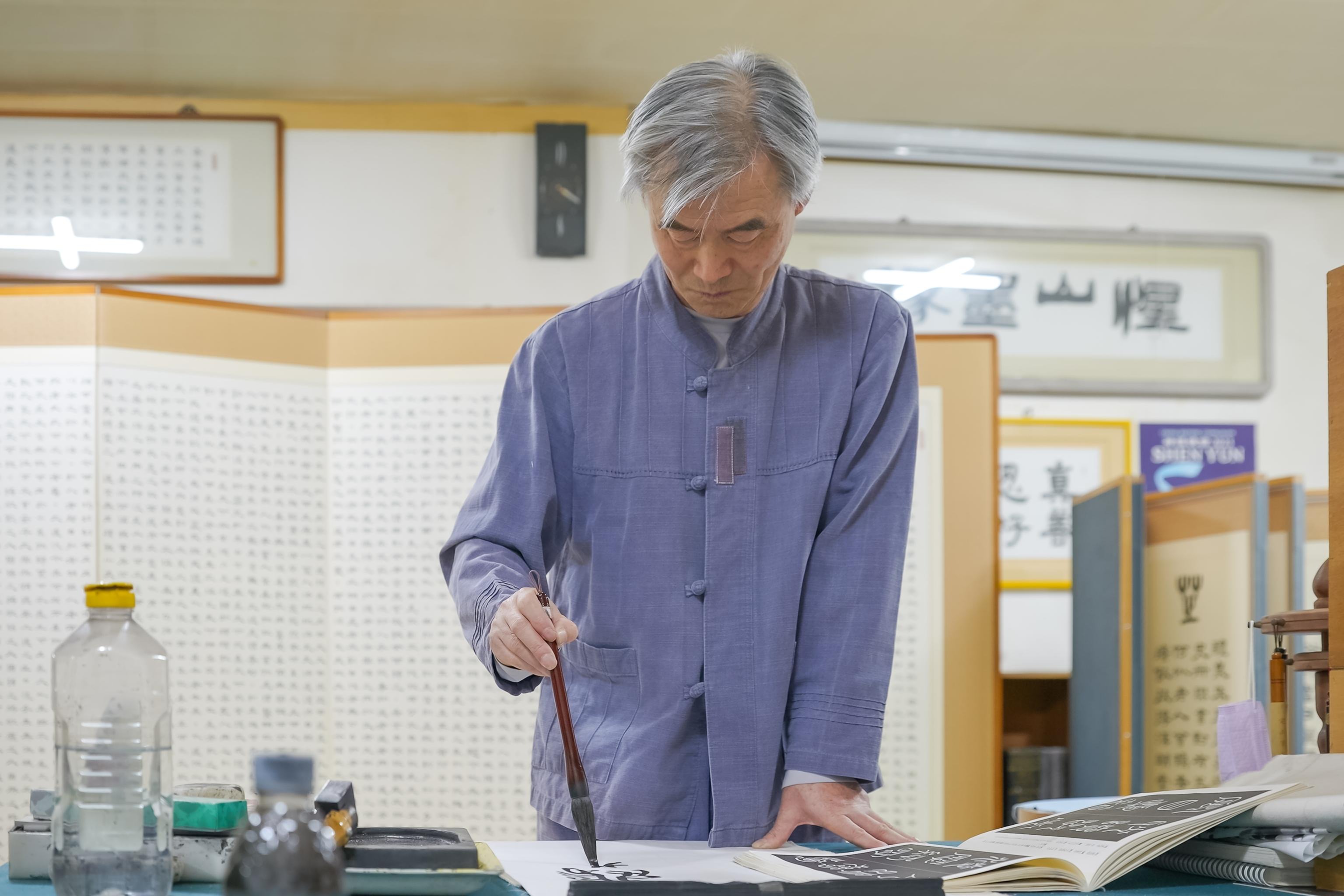 以凌晨炼功开启每天生活的金先生,每天一大早就去书法院指导学生,并进行作品创作活动。周末,除了去看望在农村生活的父母外,他就会向韩国民众介绍“法轮大法”。