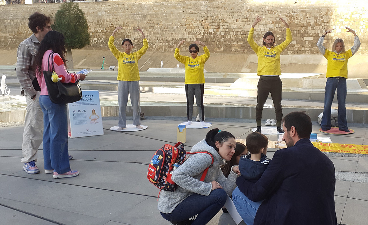 活动当天天气晴朗,广场上的法轮功展位格外引人注目,学员们向路过的人们演示五套功法,分发介绍法轮功的单张。许多市民和游客被舒缓的炼功动作所吸引,对法轮功产生浓厚的兴趣,他们上前与学员交谈,希望了解更多有关功法以及中共迫害法轮功的信息。