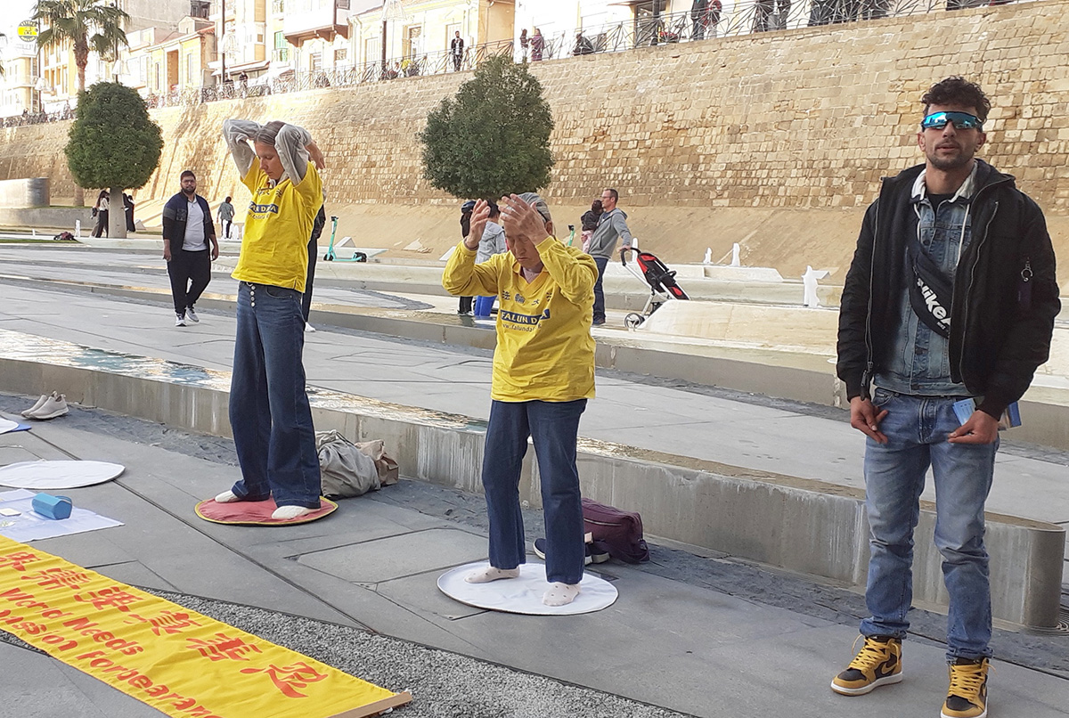 一位来自中国的年轻人在欧洲友人的陪同下来塞浦路斯旅游,他们观看了功法演示,学员向他讲述了中国的学员们因坚持信仰而遭受的残酷迫害。