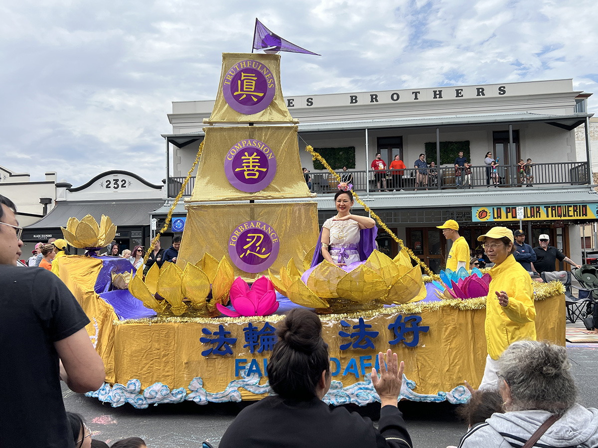 法轮功学员带来的金色花车传递真善忍的美好福音,身着仙女服装的学员在花车上展示着静功动作,唐装方阵的表演展现古典与传统,身着金黄色印有“法轮大法好”字样T恤的学员们面带微笑向观众展示舒缓的功法动作。