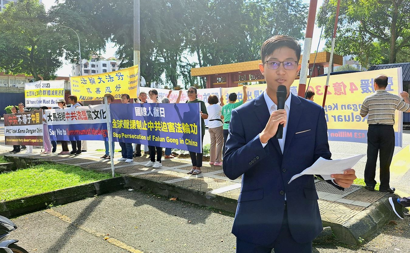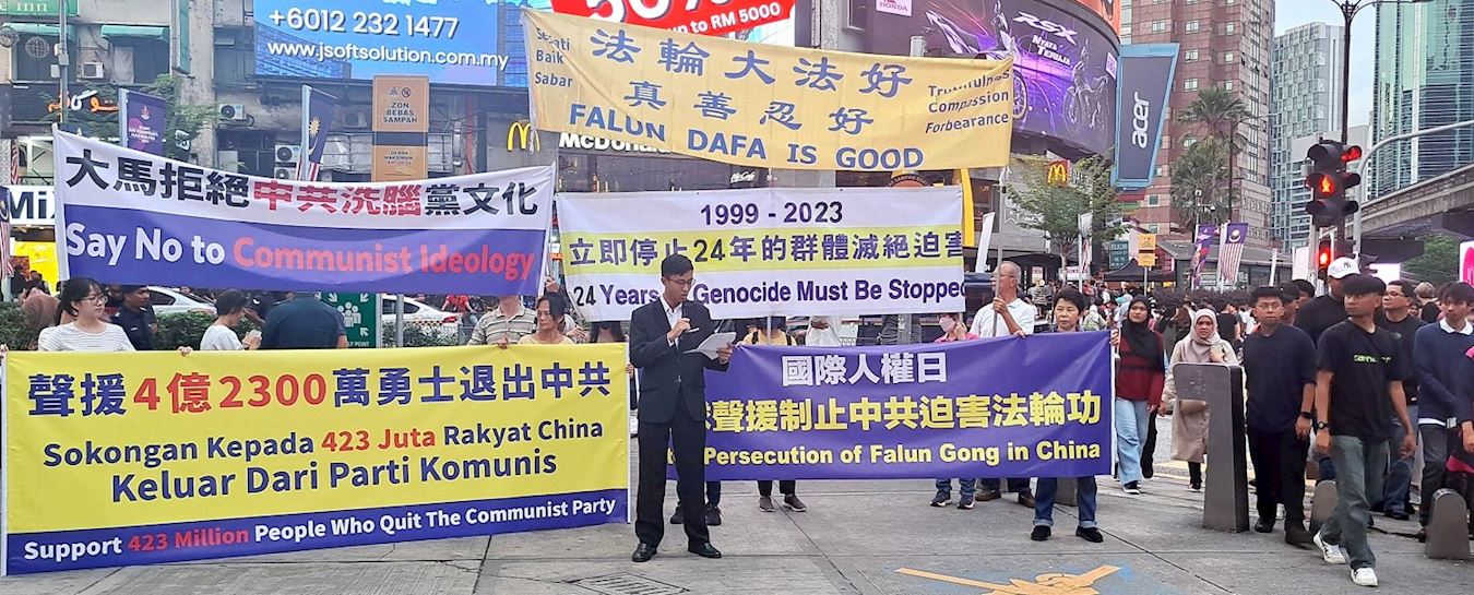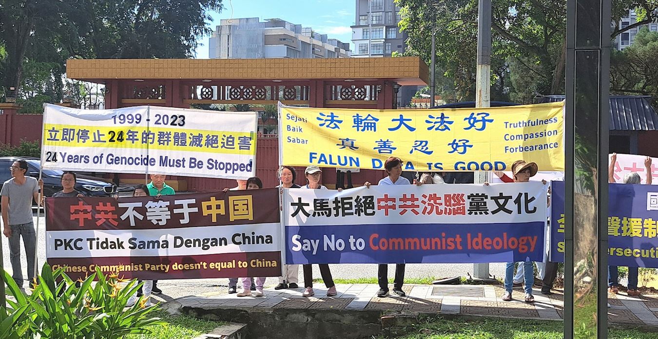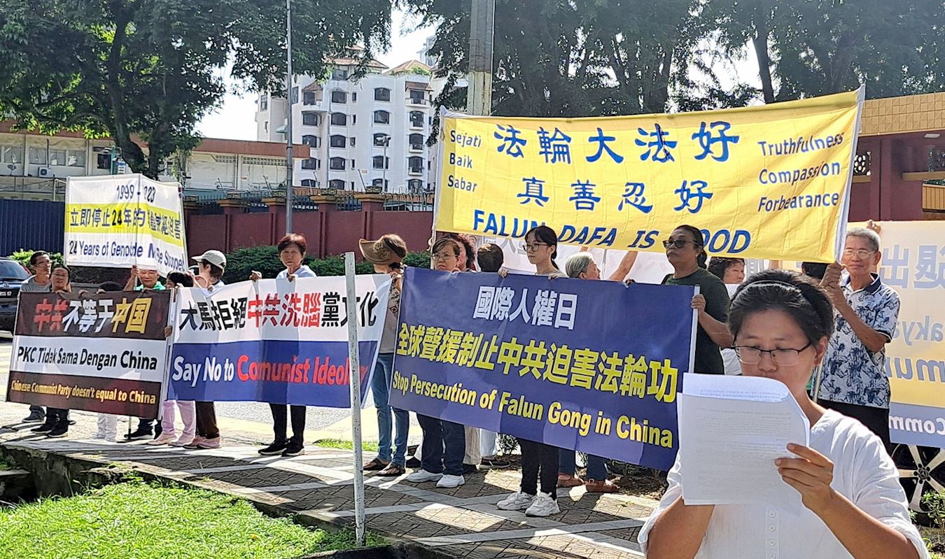 法轮功学员在现场手举多个横幅,并用中文和马来文宣读文稿,强烈谴责中共持续二十四年对法轮功的残酷迫害,同时呼吁各界人士都来关注这场历史上最严重的迫害,一起来制止这二十一世纪最大的人权浩劫。