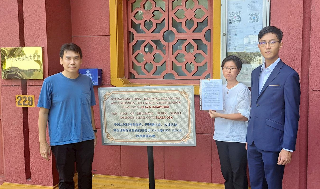 ![]() 图4:马来西亚法轮功学员来到中共驻马使馆,呼吁中共停止对法轮功的迫害。 |