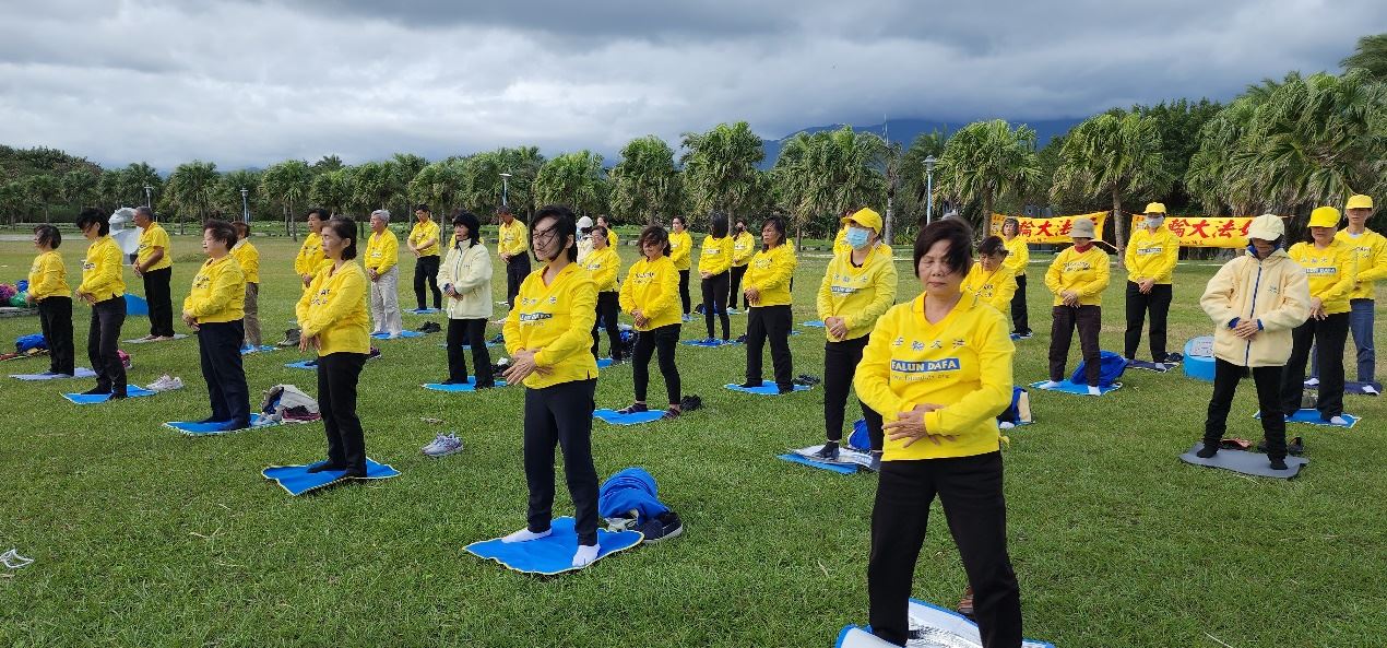 冬日的曦阳展颜,清澈而和煦,悠扬的炼功音乐在一望无际的太平洋不绝于耳,花莲大法弟子排列整齐,展示五套功法的祥和美好;部分学员手拿《法轮大法好》、《世界需要真善忍》特刊,向民众讲真相并送上一份份的新年祝福及关怀。