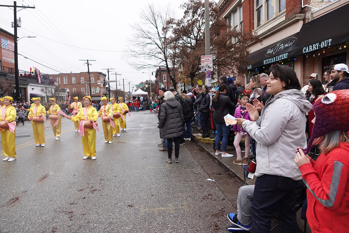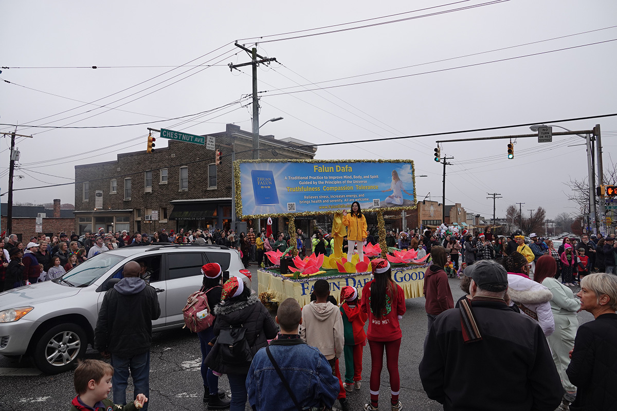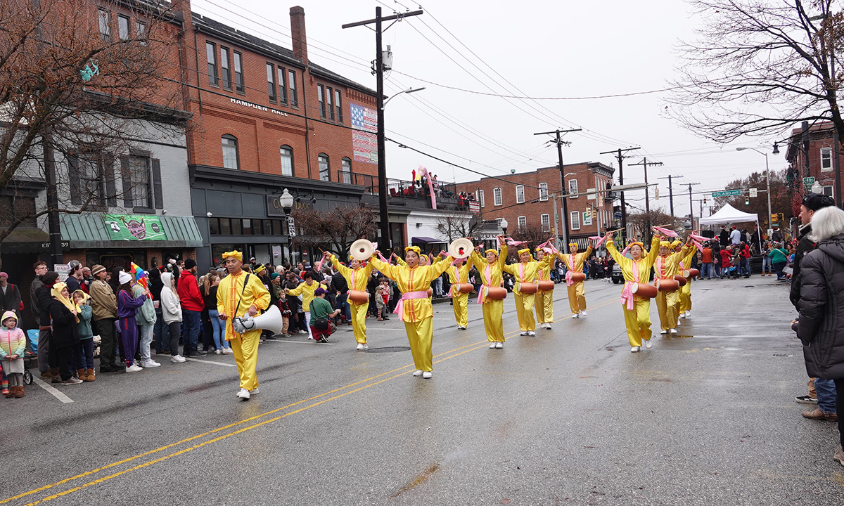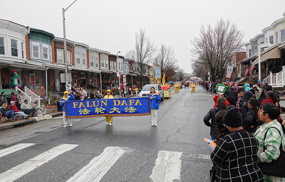 大华府地区部分法轮功学员组成的腰鼓队和花车参加了巴尔的摩圣诞游行,学员在花车上演示功法,观看游行的民众纷纷向法轮功学员要传单。