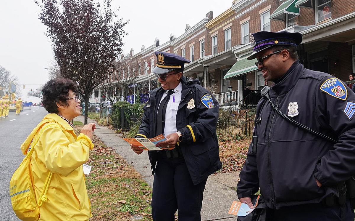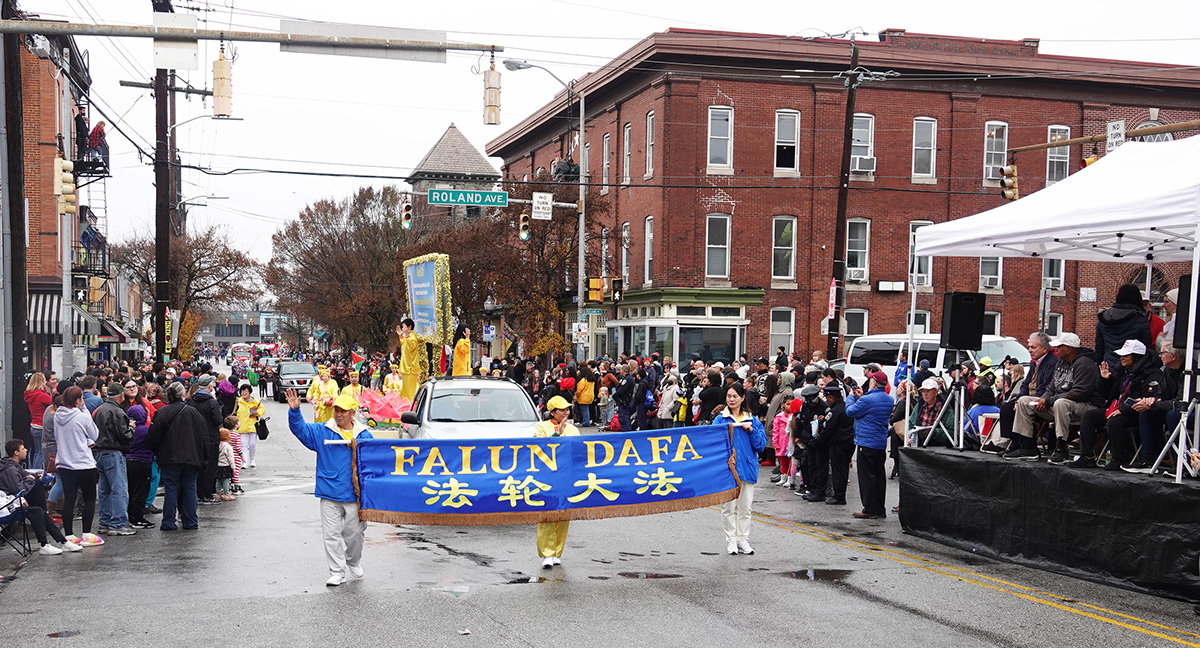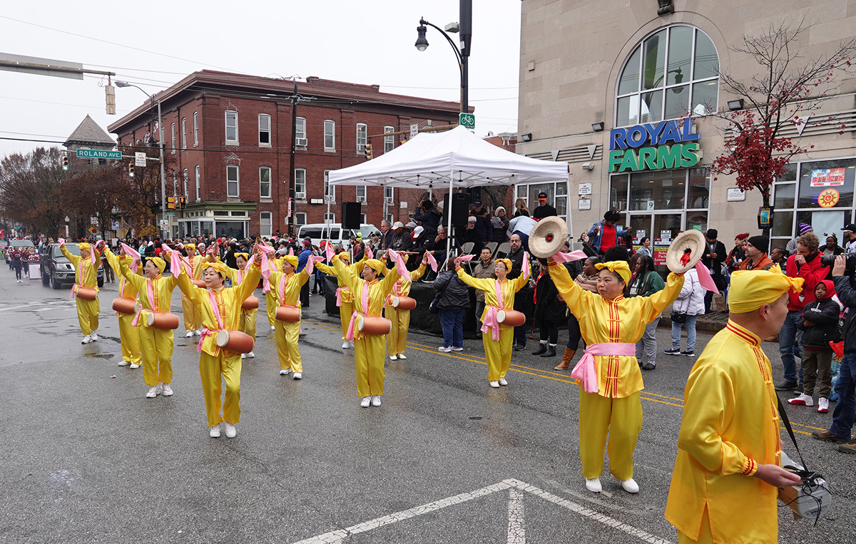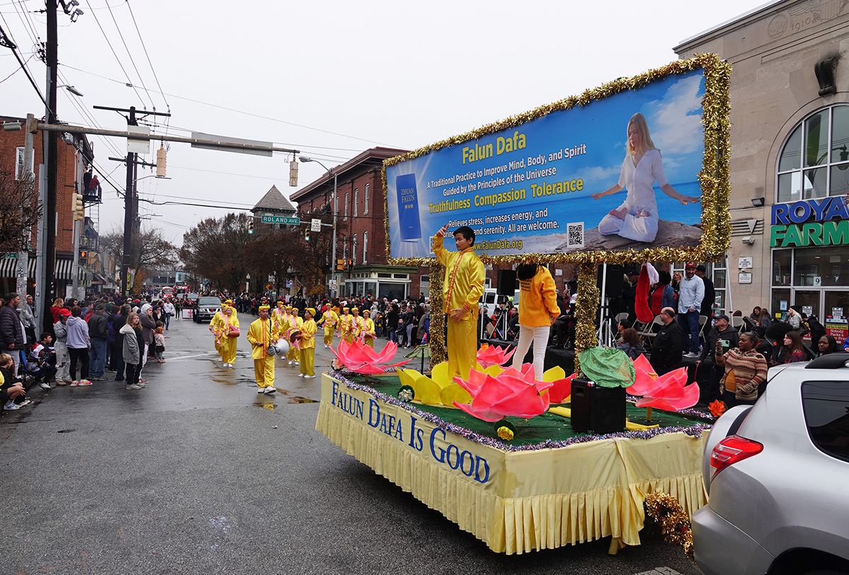 大华府地区部分法轮功学员组成的腰鼓队和花车参加了巴尔的摩圣诞游行,学员在花车上演示功法,观看游行的民众纷纷向法轮功学员要传单。
