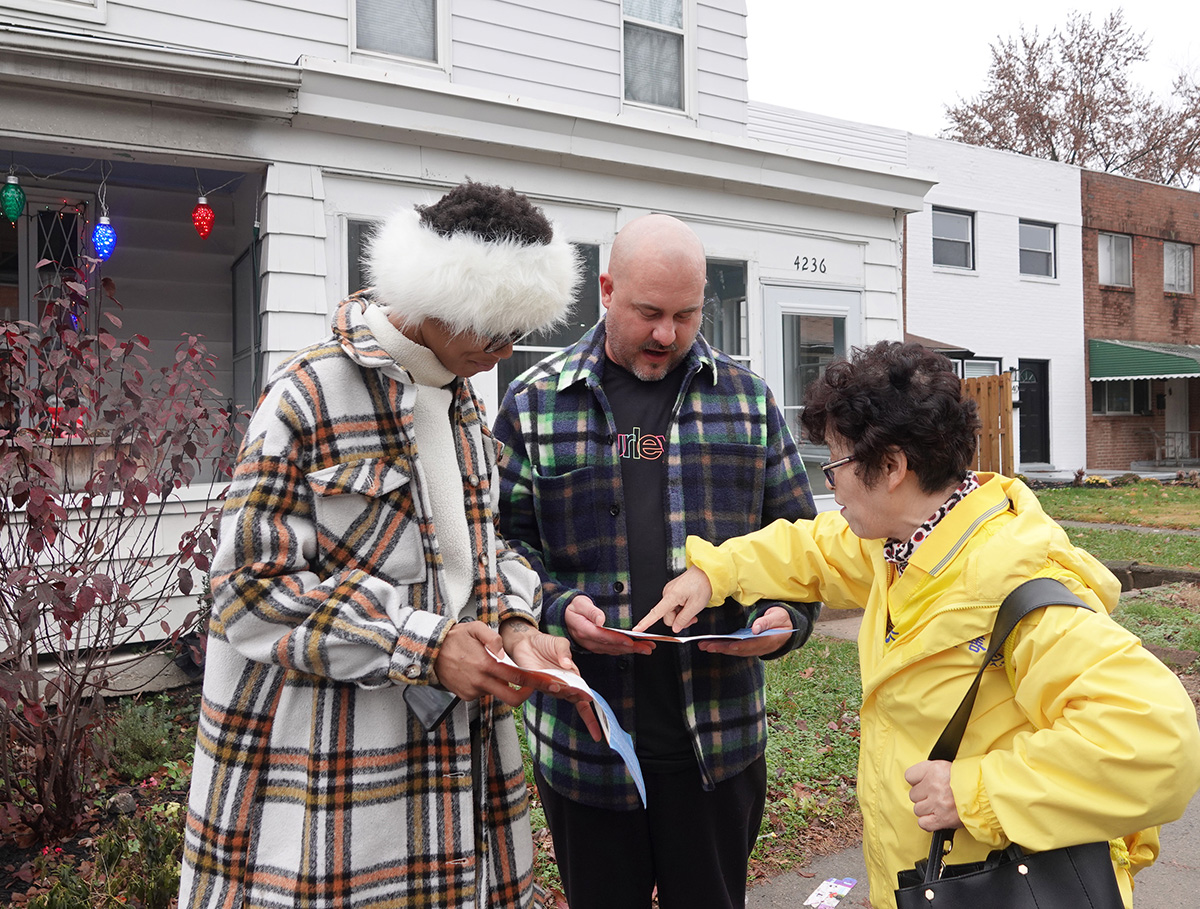 凯莉(Kellie)和先生各自拿到一份法轮功真相传单,他们仔细阅读传单的内容。凯莉说,她刚刚被诊断出患有高血压,她想尝试打坐。看到花车上法轮功学员演示功法,她对法轮功功法很感兴趣,仔细查看传单上的法轮大法网站信息。