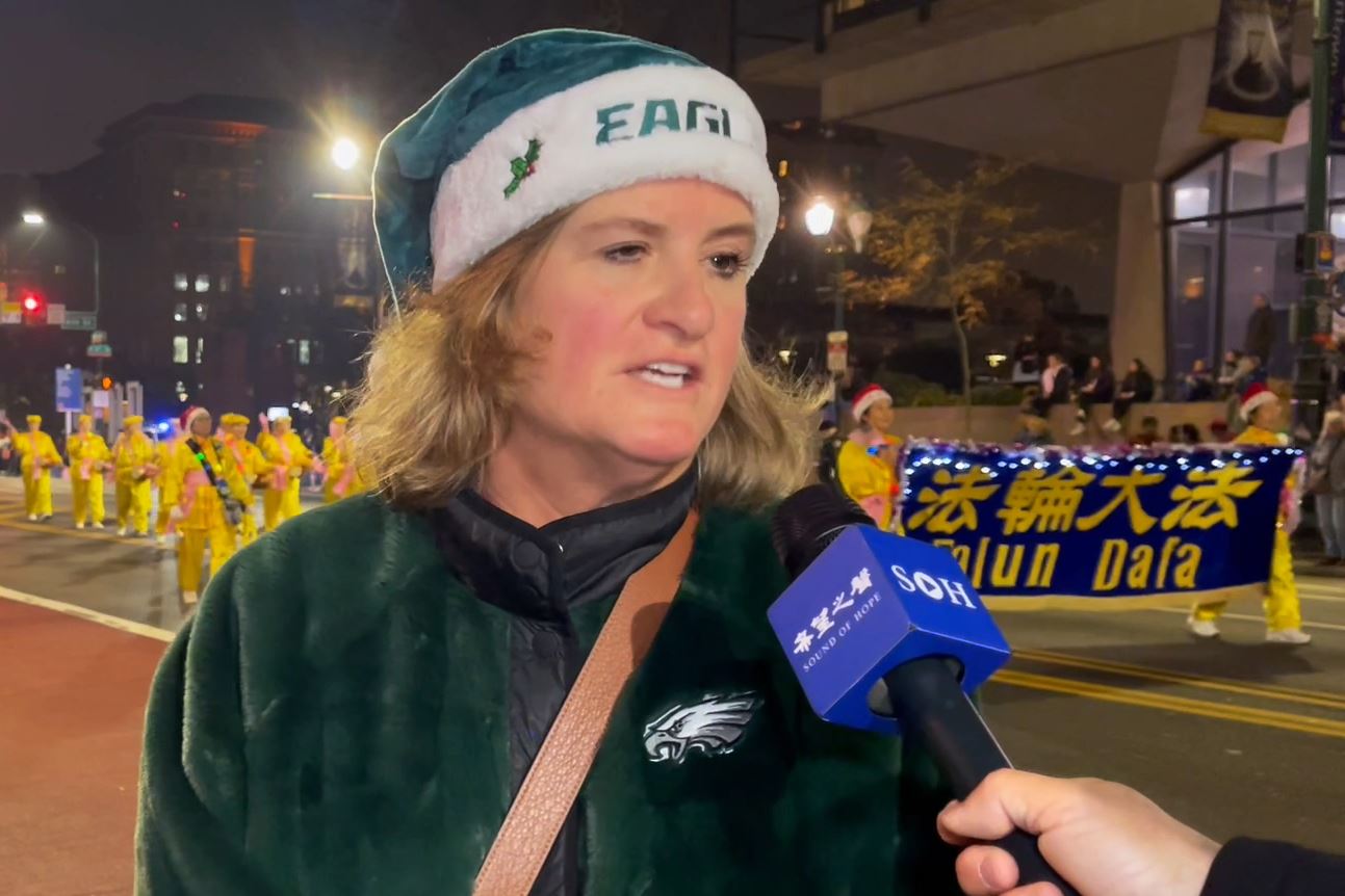 在一家公司人力资源部工作的安吉拉·特罗根(Angela Trogeon)很高兴看到游行队伍中的法轮功队伍。“感觉太好了。我喜欢他们的乐队、服装和游行的节日气氛。”特罗根说:“很有文化气息,我也喜欢腰鼓和音乐。”