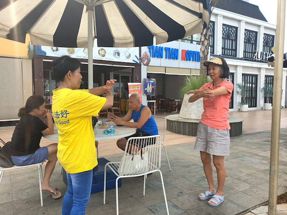 集体炼功结束后,学员向周围的游客们分发真相资料,那位正在与丈夫和朋友们聊天的妇女,又走过来请学员继续教她第一套到第四套功法。除了教她炼功动作以外,学员也介绍法轮功在中国发生的状况。他们都认真地听了真相。交谈最后,得知有李老师亲自教功的炼功的影片,她请学员将影片的链接发到她手机里。
