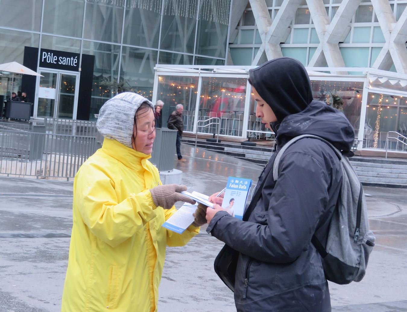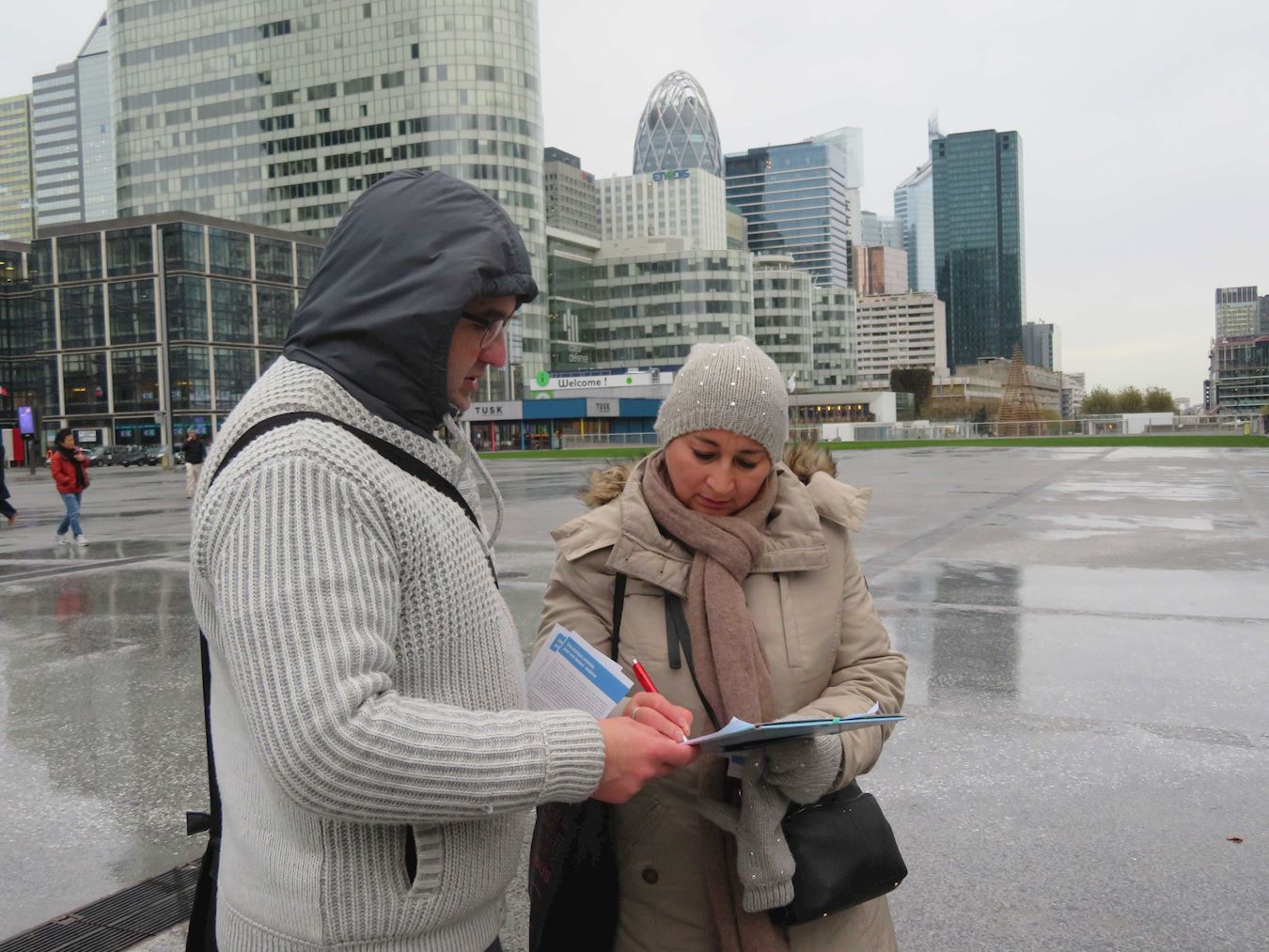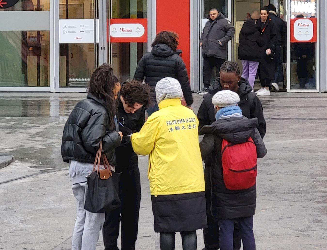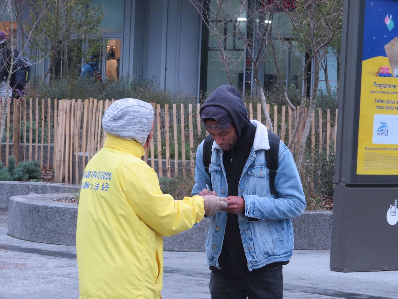 拉德芳斯是巴黎金融中心。中午时分,人们从办公楼出来用餐、休息,看见法轮功学员演示法轮功功法,便主动前往了解更多信息。当他们得知法轮功学员在中国因修炼真、善、忍而遭到中共迫害,甚至被强行活体摘取器官,感到非常震惊和愤怒,他们在反迫害请愿书上签字,表达心愿,希望早日停止迫害。