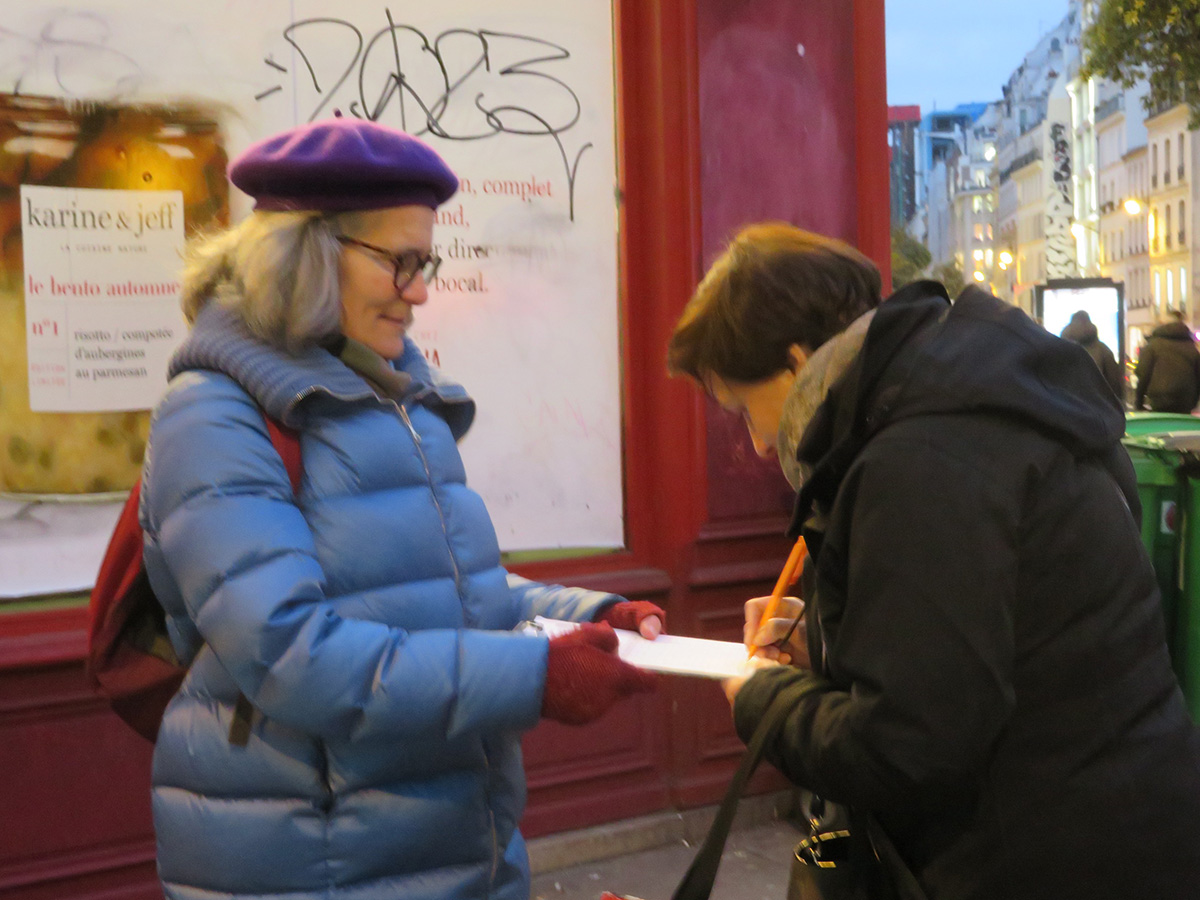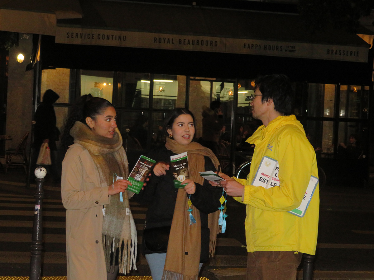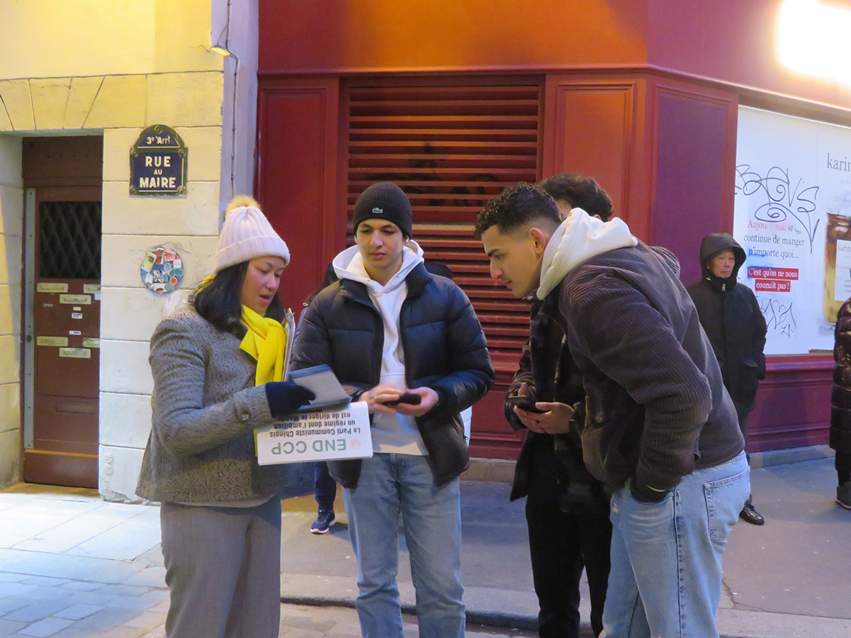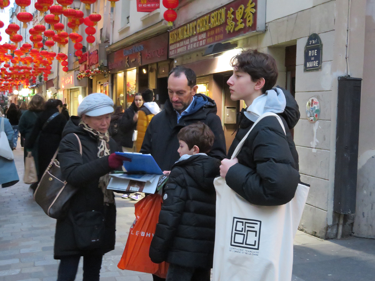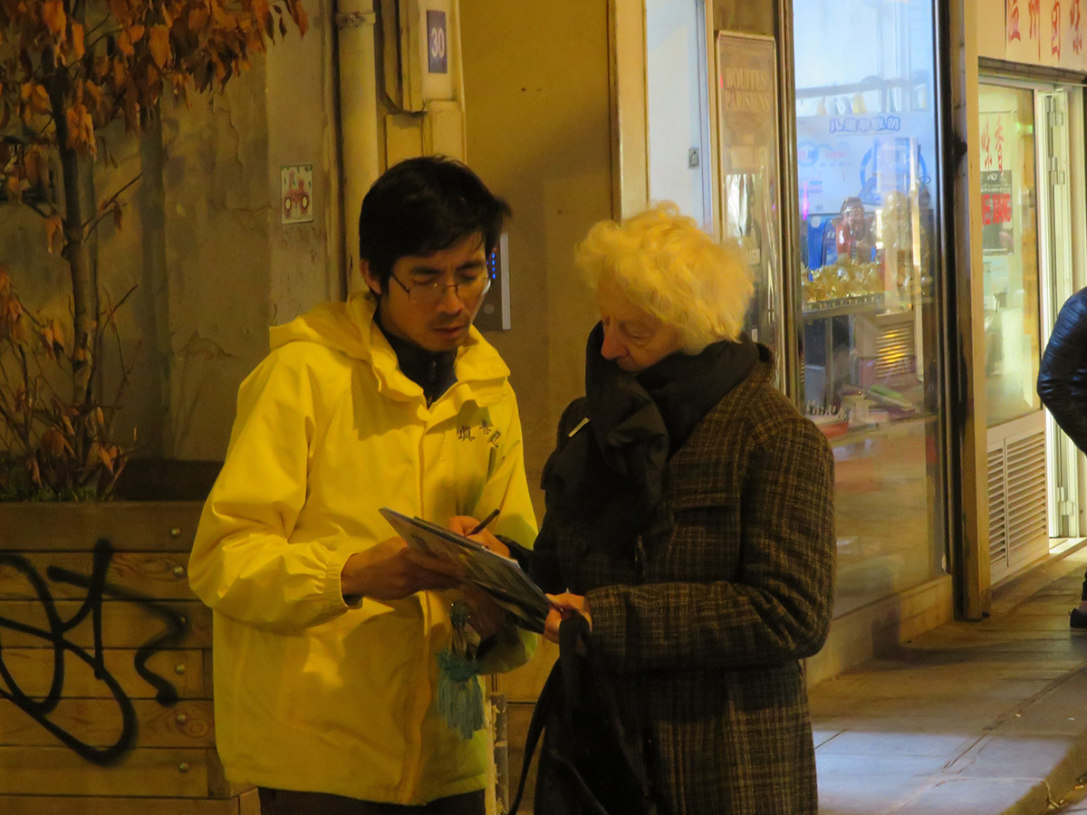 法轮功学员的真相展台上摆放着中法文的真相资料,还有刚出版的《大.纪.元;时报》,头版头条刊登了《为什么会有人类》经文,供华人索取阅读。看见横幅“中共是最邪恶的病毒祸害全世界”,不需解释,人们自动过来签字反对中共对法轮功的迫害。