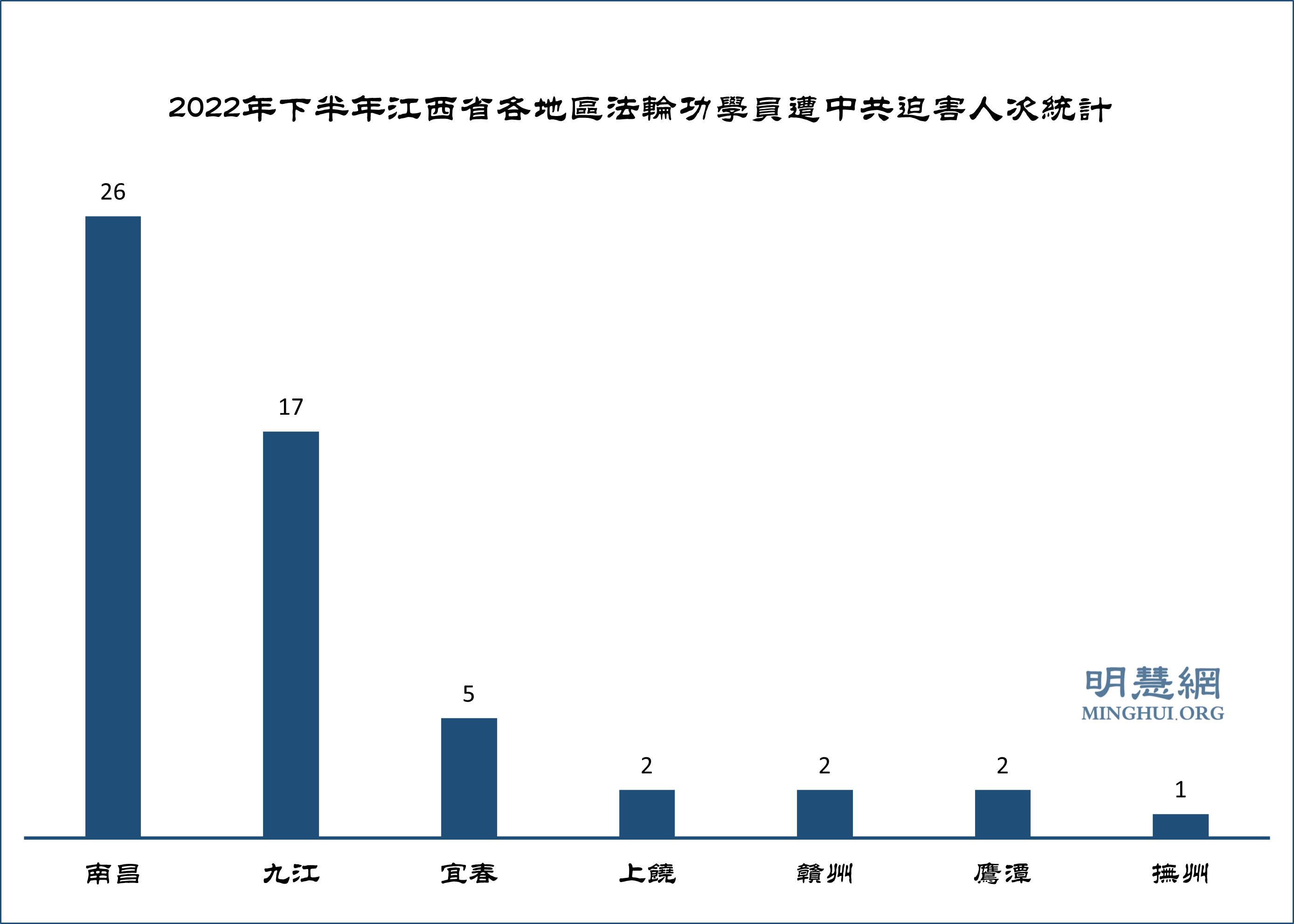 ![]() 图1:2022年下半年江西省各地区法轮功学员遭中共迫害人次统计 |