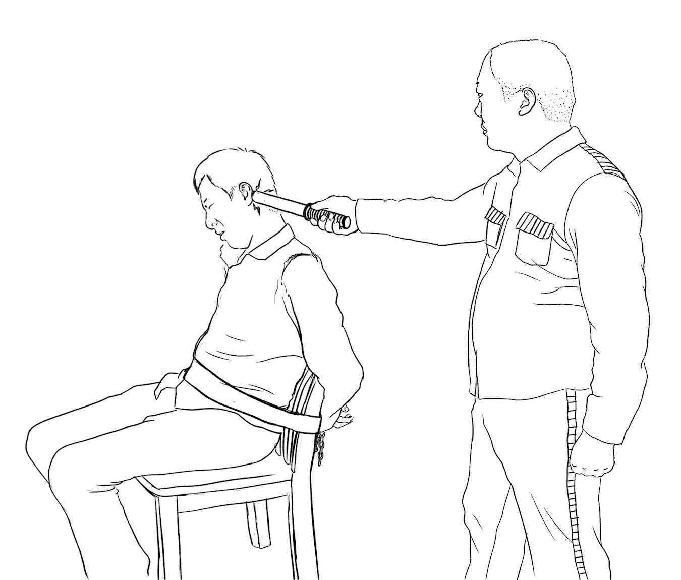 法轮功学员被捆绑坐在木制椅子上遭受电棍电击(坐在铁椅子上不用捆绑,因为手脚处都有锁扣,手脚都锁扣上)