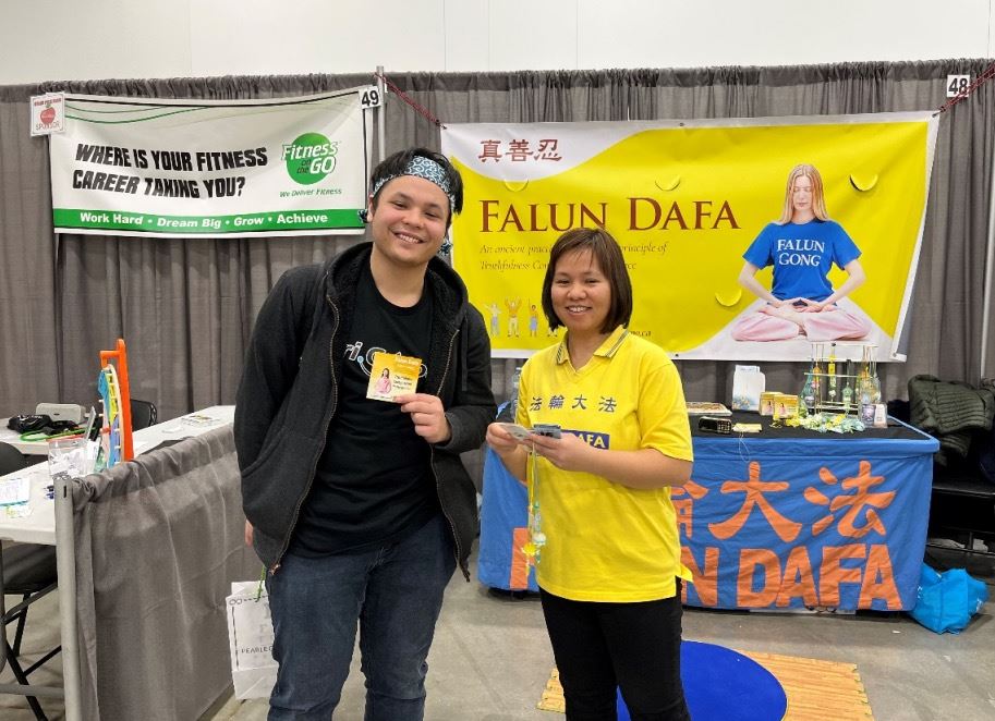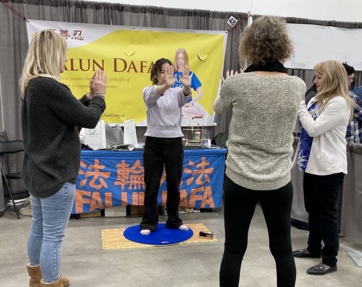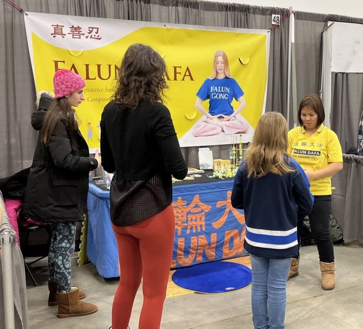 在展会期间,法轮功学员设立了展位,向民众展示法轮大法(法轮功)功法的美好,并提供义务教功。经过大法展位的参观者络绎不绝,他们有的欣喜地接受介绍大法的真相资料,有的现场学炼功法。不少参观者在学炼功法后表示感觉很舒服,并表示希望能继续学炼。