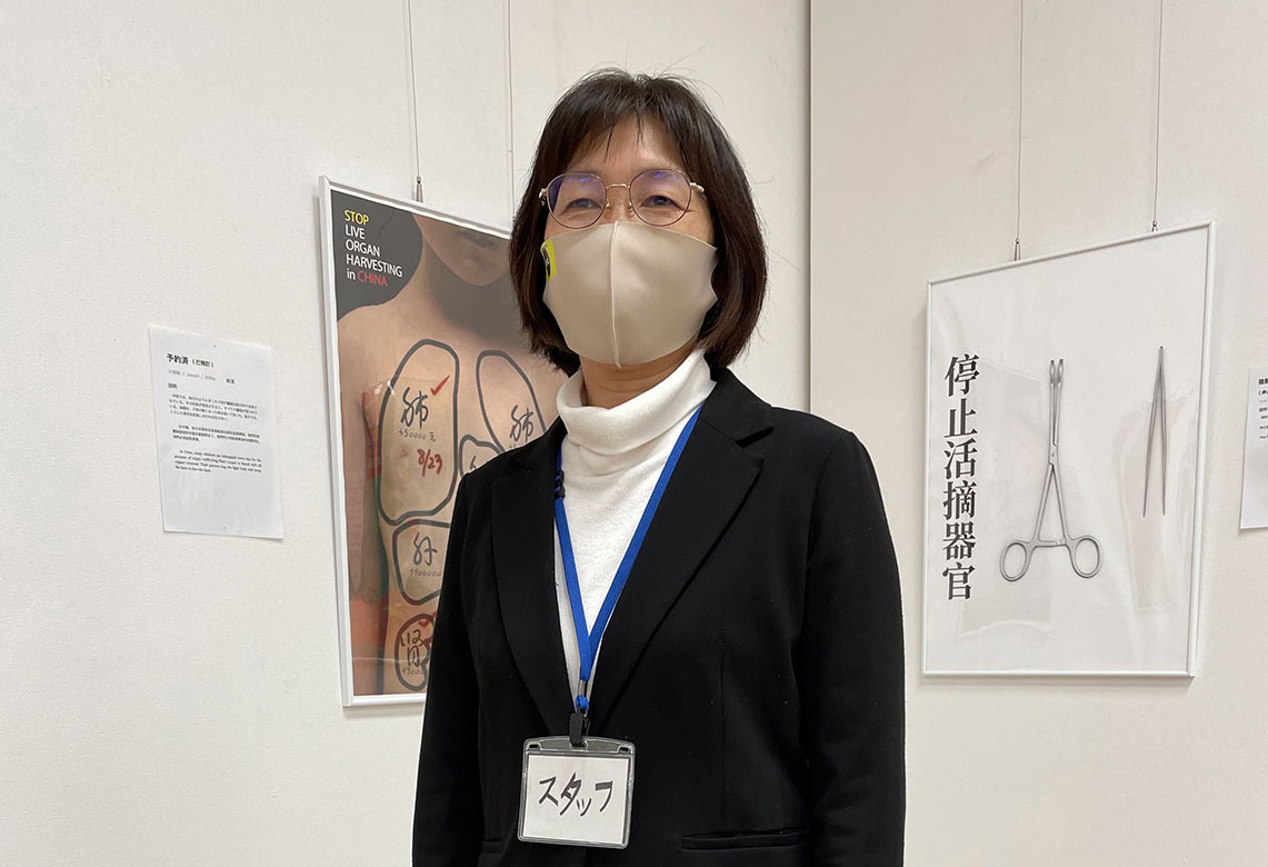Akiko(明子)女士是从旁边的传统工艺展知道信息前来的。在听到“在中国只要给医院打电话说想做器官移植手术,只需要一周就可找到匹配的器官。有相关的证据录音”的说明后,明子女士说:“太残忍了”。