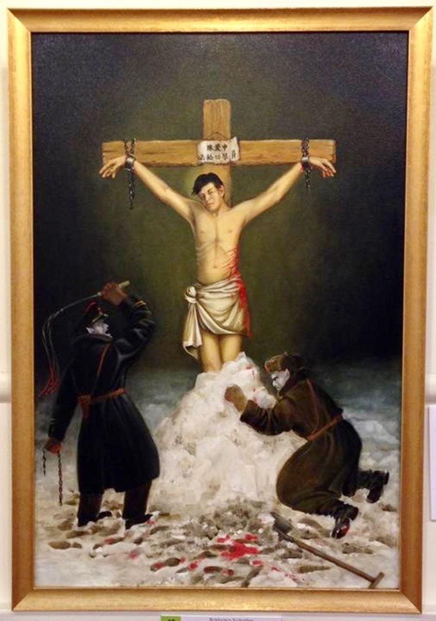 画一幅在雪地里被吊在十字架上受难的景象是很有挑战性的。我必须捕捉到施暴者的可恶,并在画布上重现这个场景。当其中的一个施暴者把雪堆在陈的脚和腿上时,他正跪在修炼人面前。最难的部份是画陈的脸。我不知道该如何呈现他痛苦的脸。我审视内心,想起了自己曾遭受的痛苦。我的生命多次被救,我知道当你放下一切,包括生死时,就不再有痛苦。我把这幅画命名为《超越忍——法轮功学员陈爱忠遭受的酷刑》。
