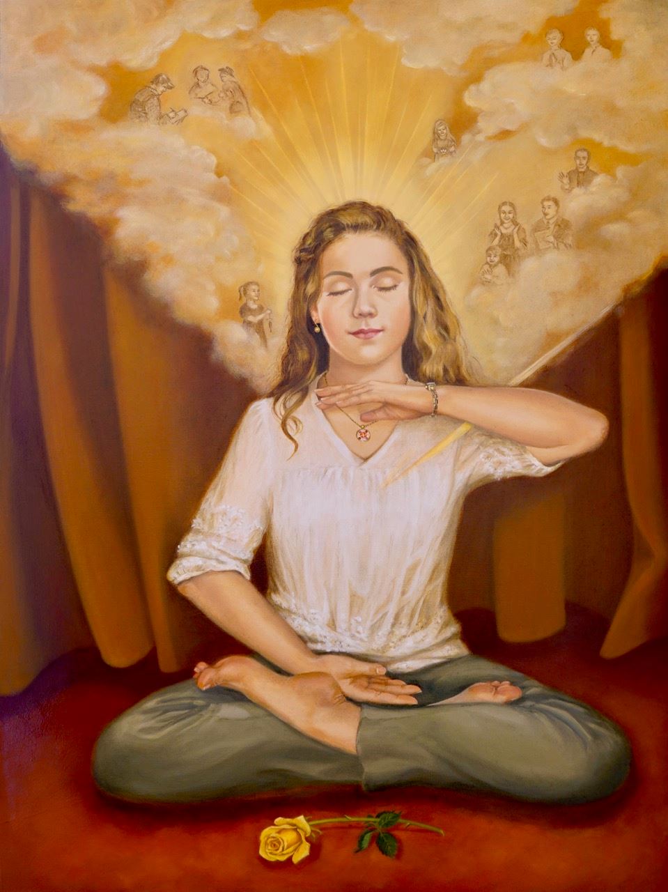 为了表现大法和大法弟子的美好,我开始画一个正在打坐的修炼人。我必须选择一个我知道的精進、心地非常好的人,因为这将反映在我的作品中。另一个同修告诉了我他天目看到的景象,他看到一个修炼人漂浮在正被她救度的人的头上。这是个有趣的主意。我一直想表达我们来到这里的救度之恩。