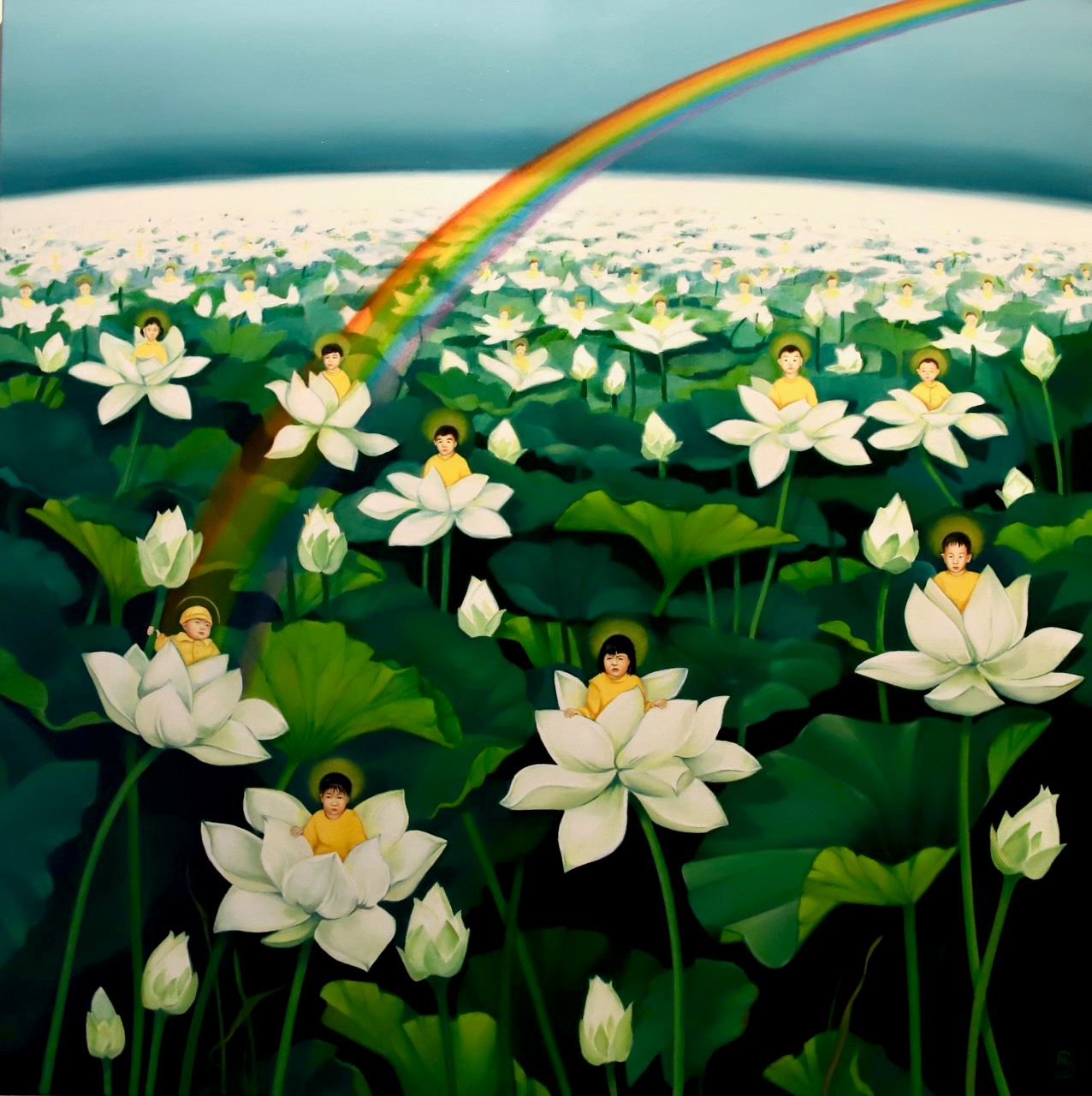 我的下一幅作品《苦海》是为了纪念那些被迫害致死或因迫害而遭受痛苦的法轮功儿童的无声苦难。有些人成为了孤儿或失去了他们所爱的家人。画面上,孩子们坐在白色的莲花上,一直延伸到地平线。一道彩虹将他们中的一些人接到了天堂。我在七月二十日之前完成了这幅画,为法轮功受迫害十九周年纪念日做好准备。画完的那天,我走到外面,看到天空中有一道美丽的彩虹。