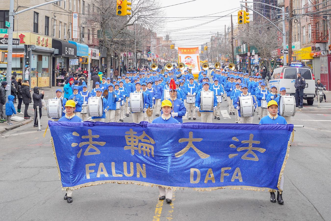 图1~12:二零二三年二月二十六日(周日),大纽约地区的上千名法轮功学员,在纽约第三大华人社区---布碌崙(布鲁克林)八大道举行盛大游行。图为包括天国乐团的第一方阵 |