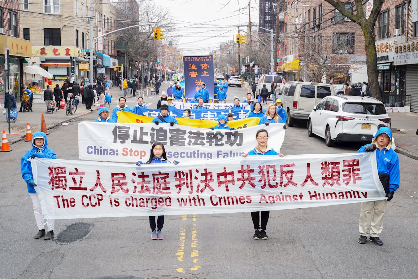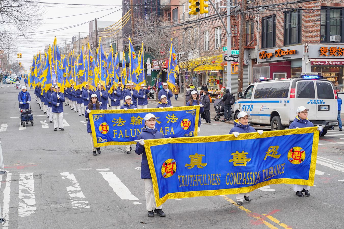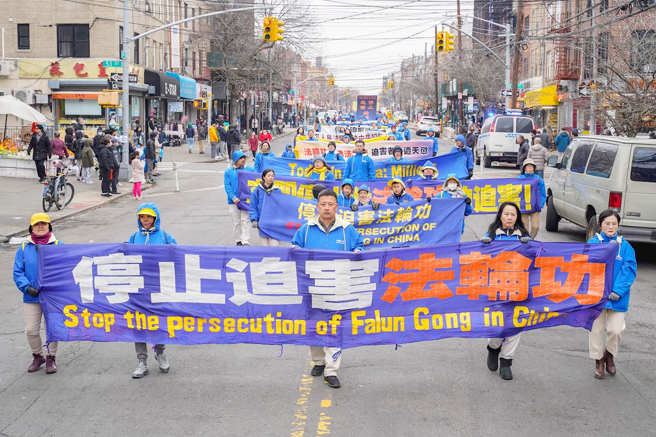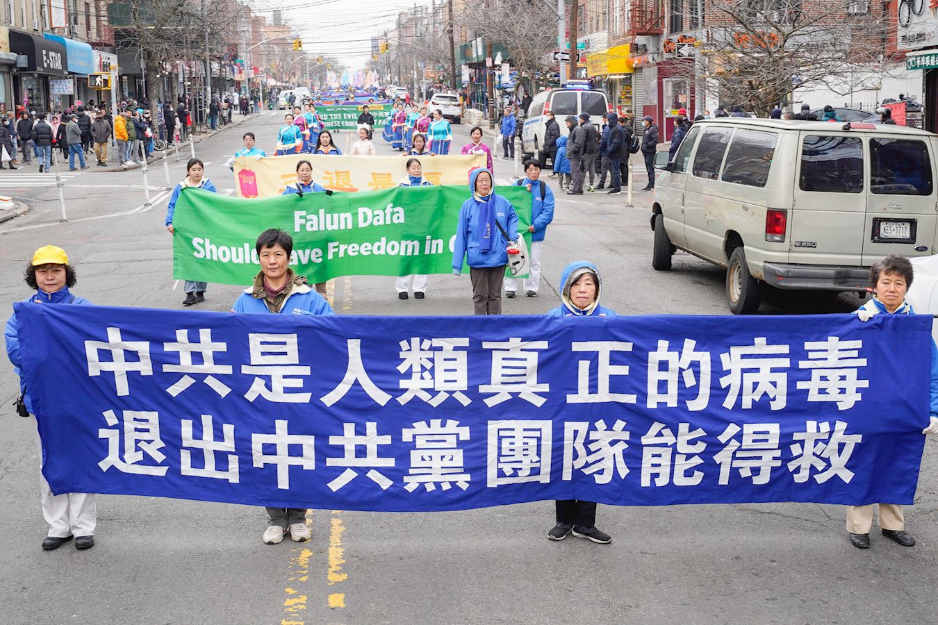 图13~17:二零二三年二月二十六日(周日),大纽约地区的上千名法轮功学员,在纽约第三大华人社区---布碌崙(布鲁克林)八大道举行盛大游行。图为“停止迫害法轮功”方阵 |