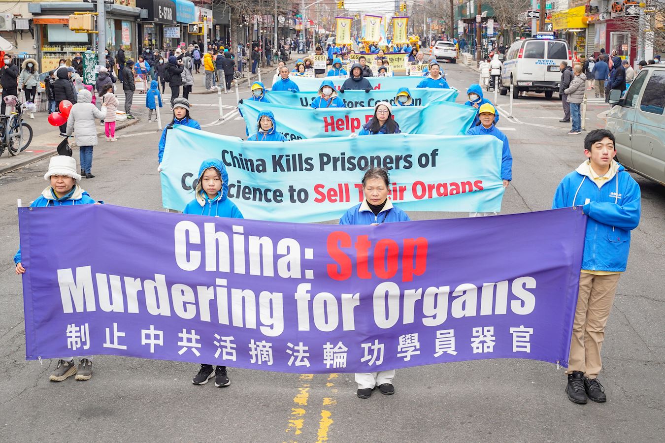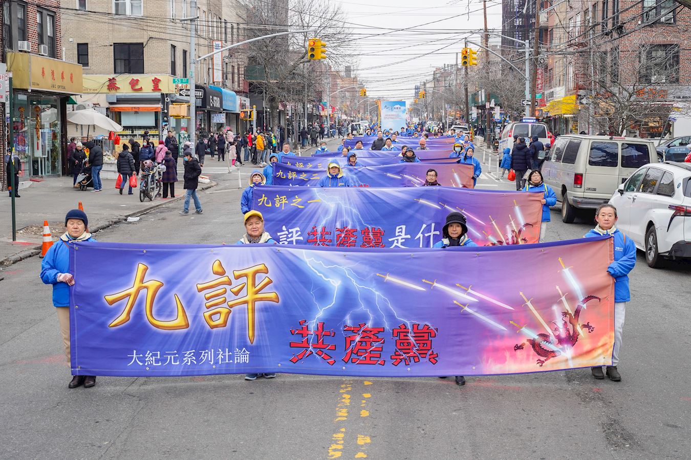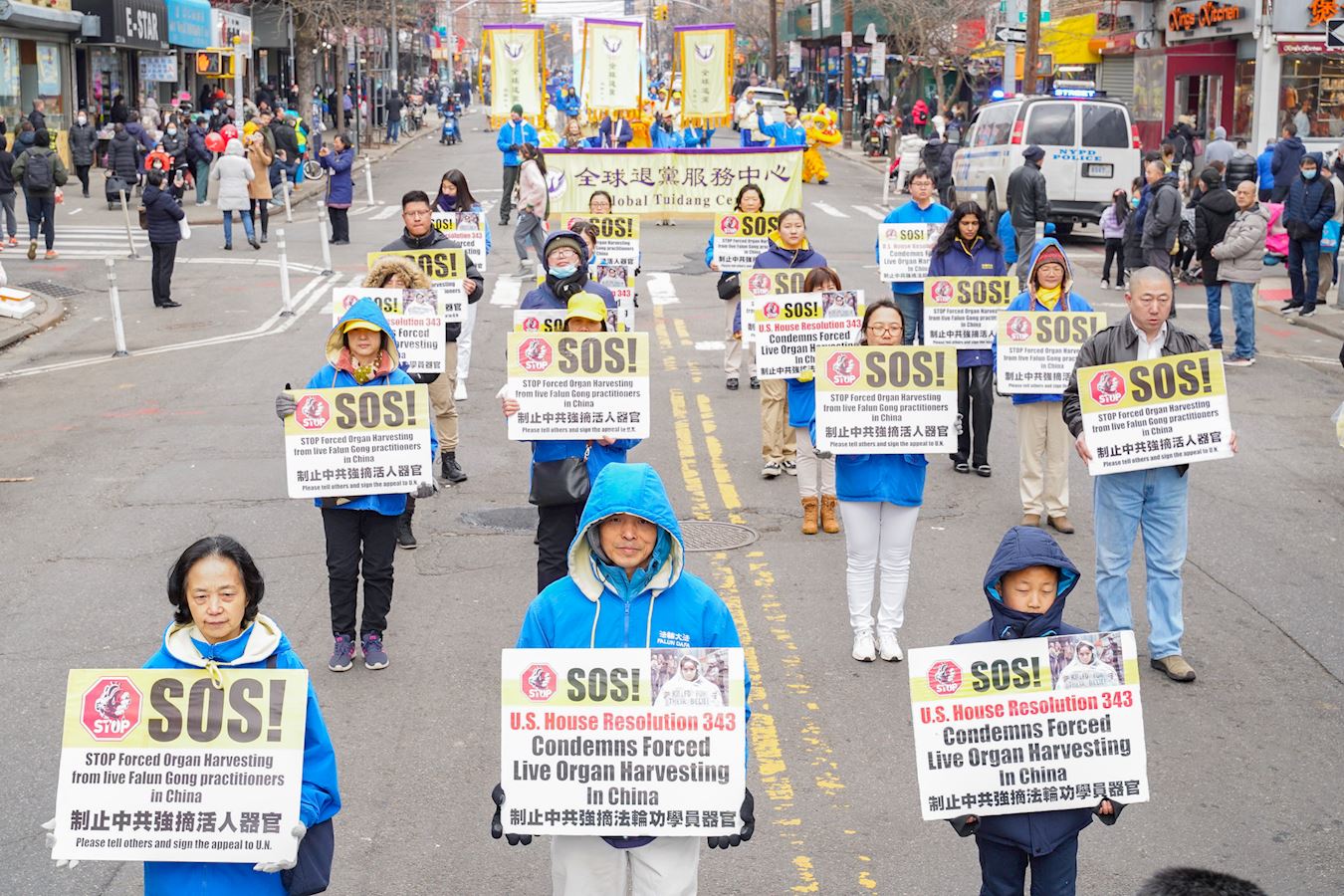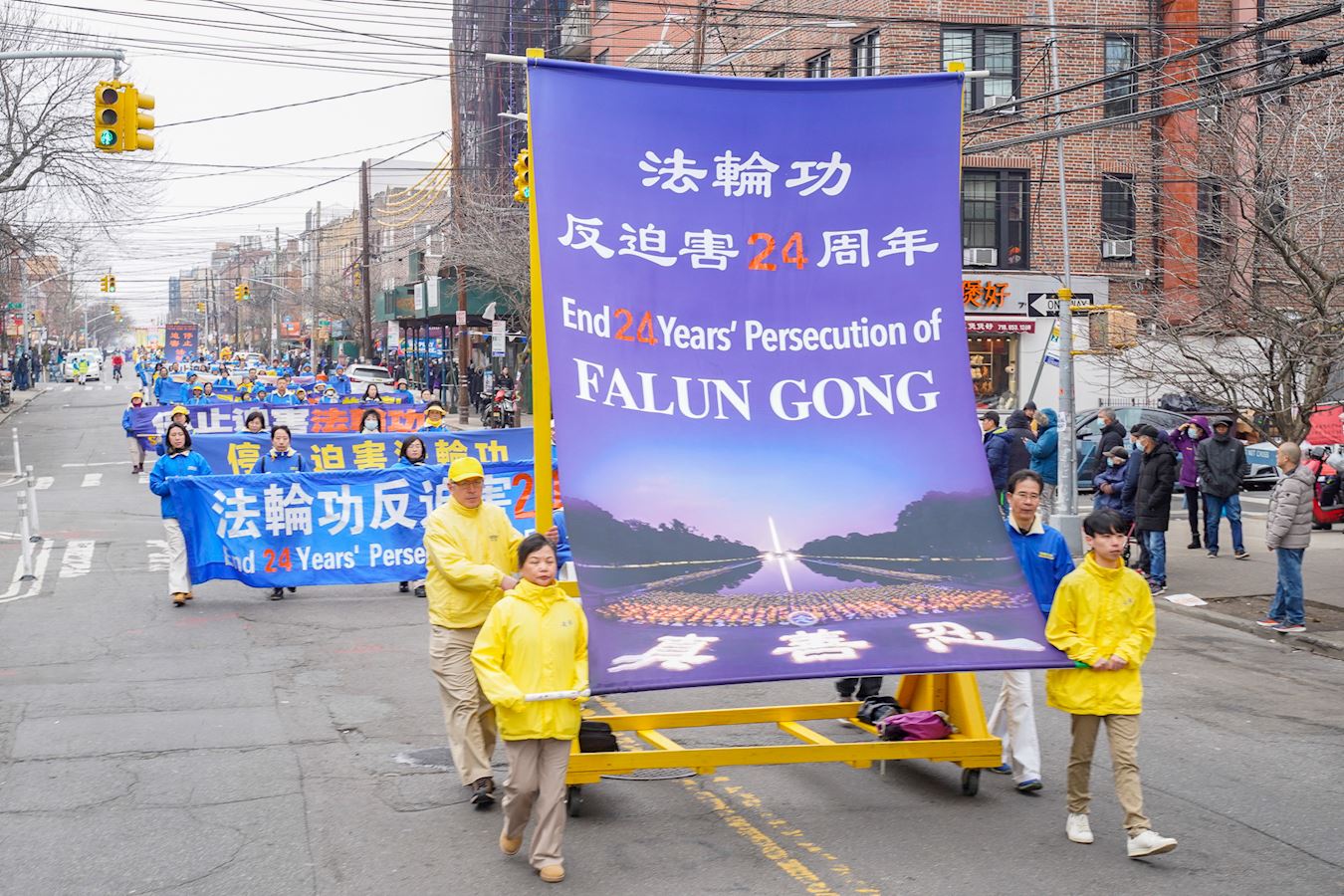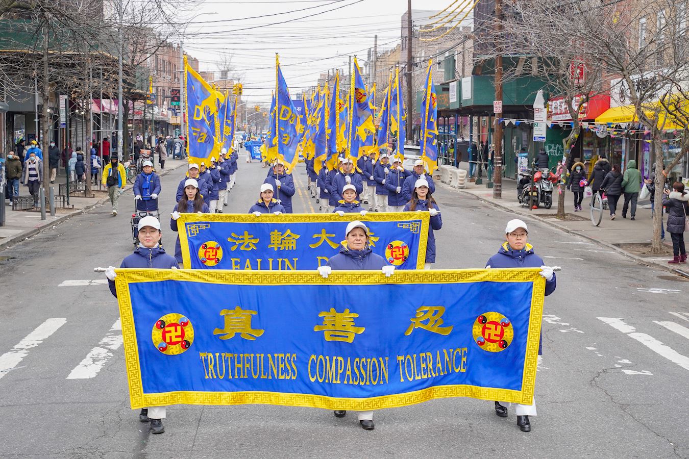 图13~17:二零二三年二月二十六日(周日),大纽约地区的上千名法轮功学员,在纽约第三大华人社区---布碌崙(布鲁克林)八大道举行盛大游行。图为“停止迫害法轮功”方阵 |