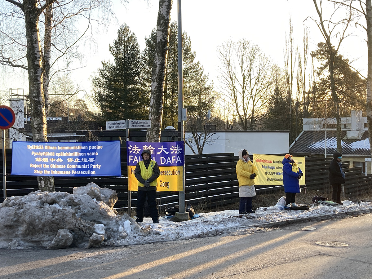 ![]() 图1:国际大屠杀纪念日芬兰法轮功学员在中共大使馆前炼功 |