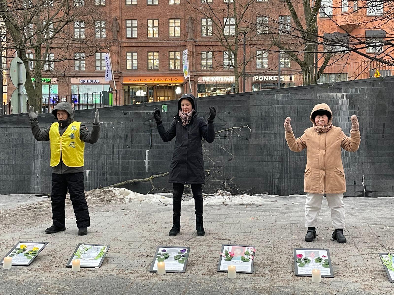 一月二十八日星期六,法轮功学员一如既往的在赫尔辛基甘比(Kamppi)购物中心附近展示功法、发传单和讲述迫害真相。
