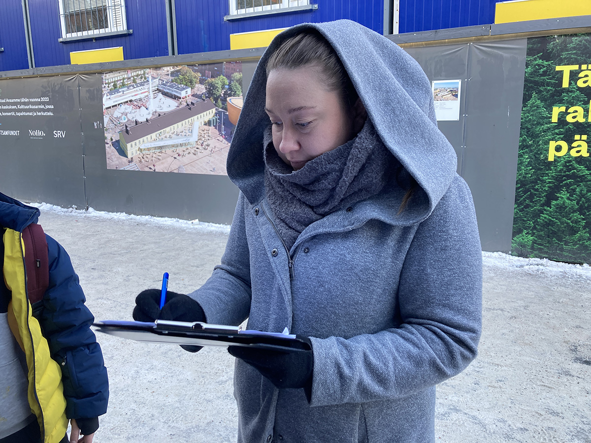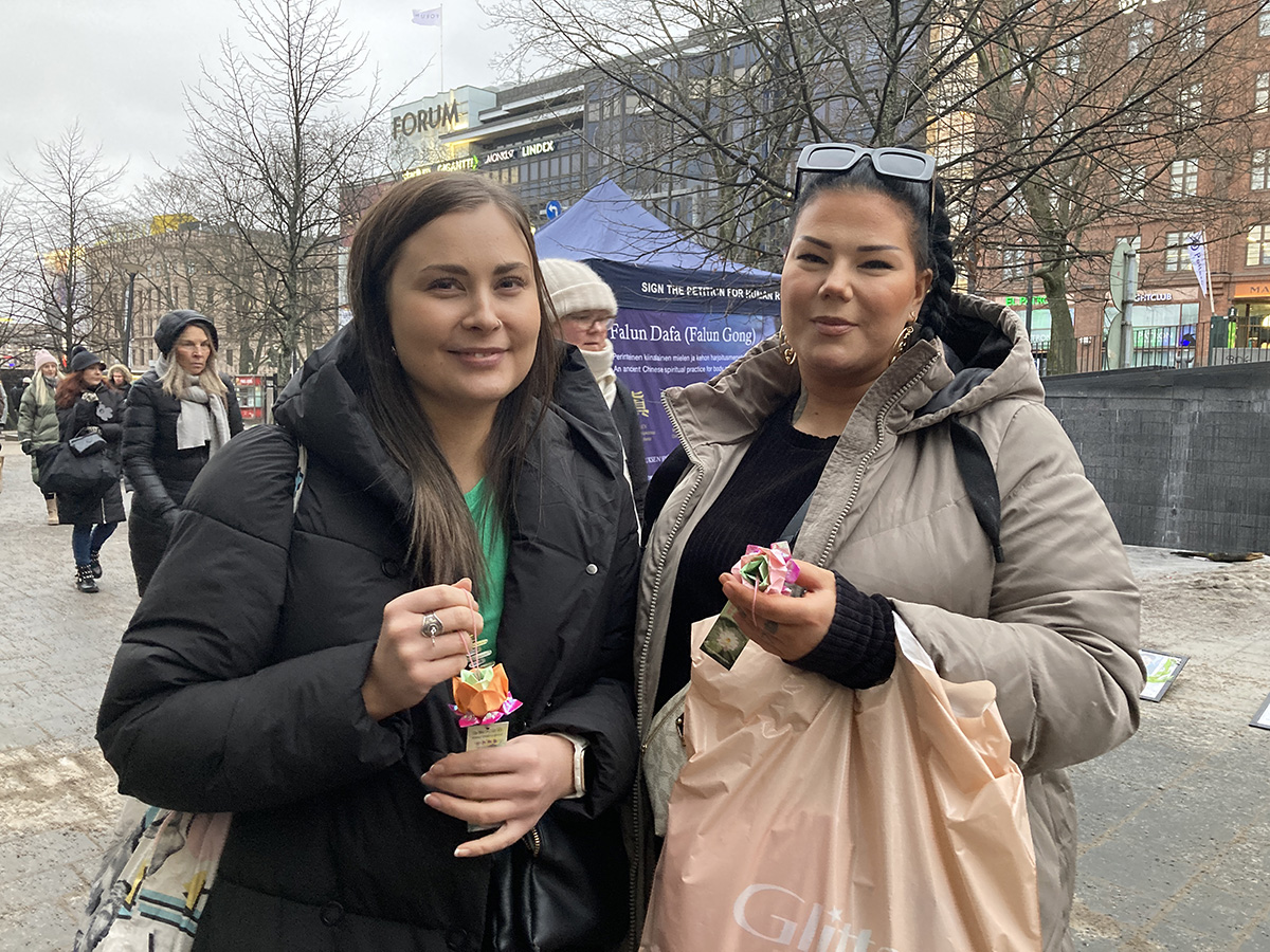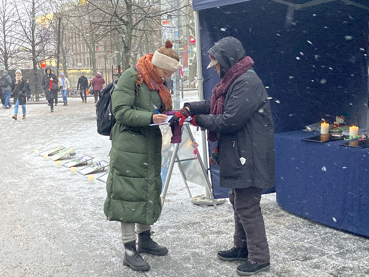桑娜(Sana)带着孩子去糖店,看见学员们的活动停下脚步签名支持反迫害。她一边签字一边悄悄抹去眼角的眼泪。她说:“这跟我们芬兰的人权不一样。作为人,不能没有自己的想法,不然人就处于封闭状态。我们每个人有自己的生活,不能这样被控制,被监禁。这是不对的!”最后她希望大陆的法轮功学员“保持坚强和注意安全”。
