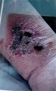 张秀琴回来后不长时间,腿上就开始红肿溃烂(见下图),到现在才逐渐好转。
