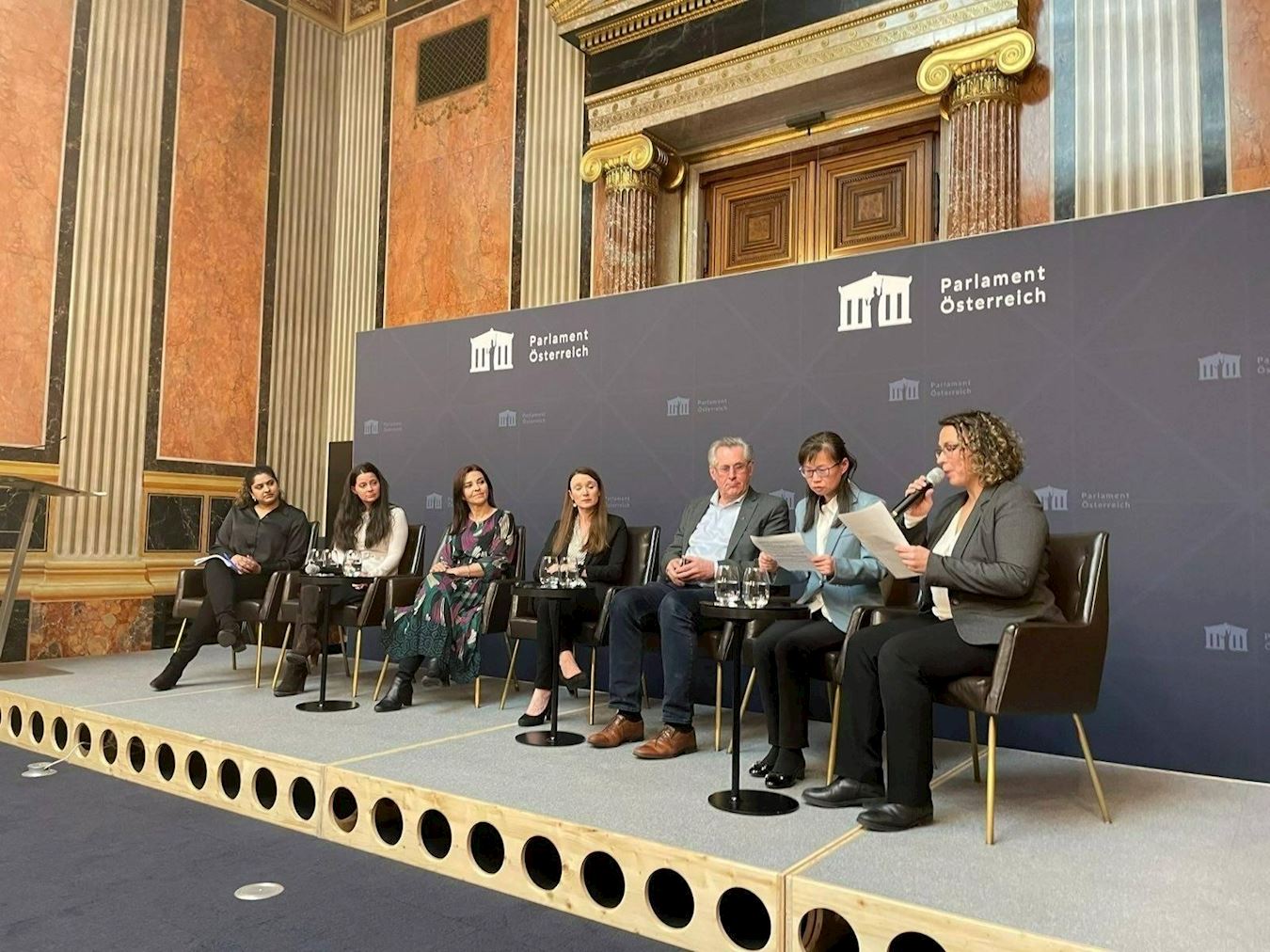 在这个活动中,奥地利法轮大法学会请来法轮功学员赵丽君作为证人,讲述了她因为修炼法轮功而遭受的迫害。
