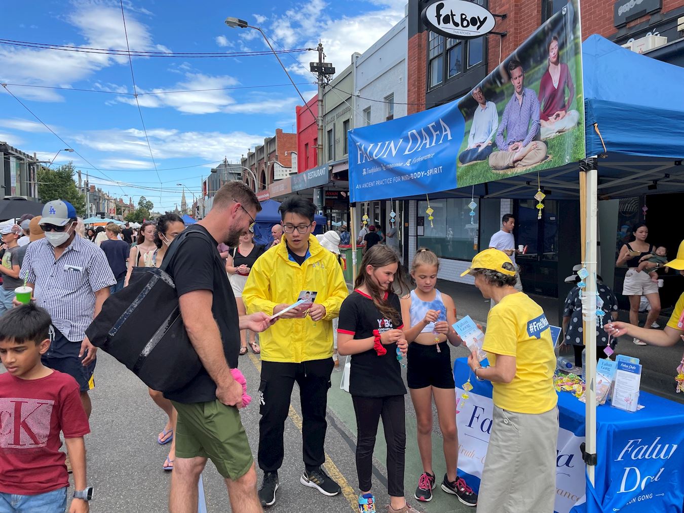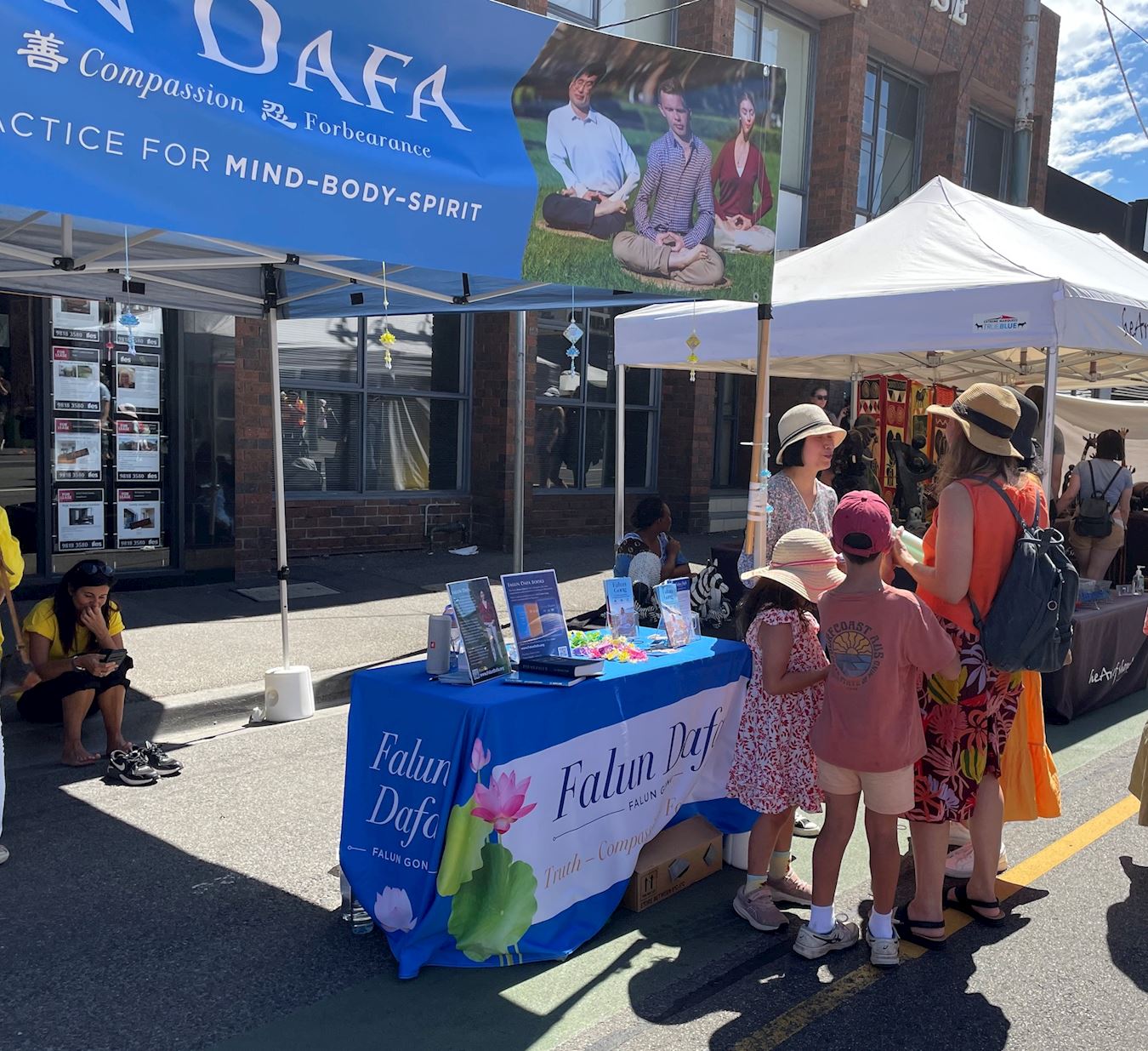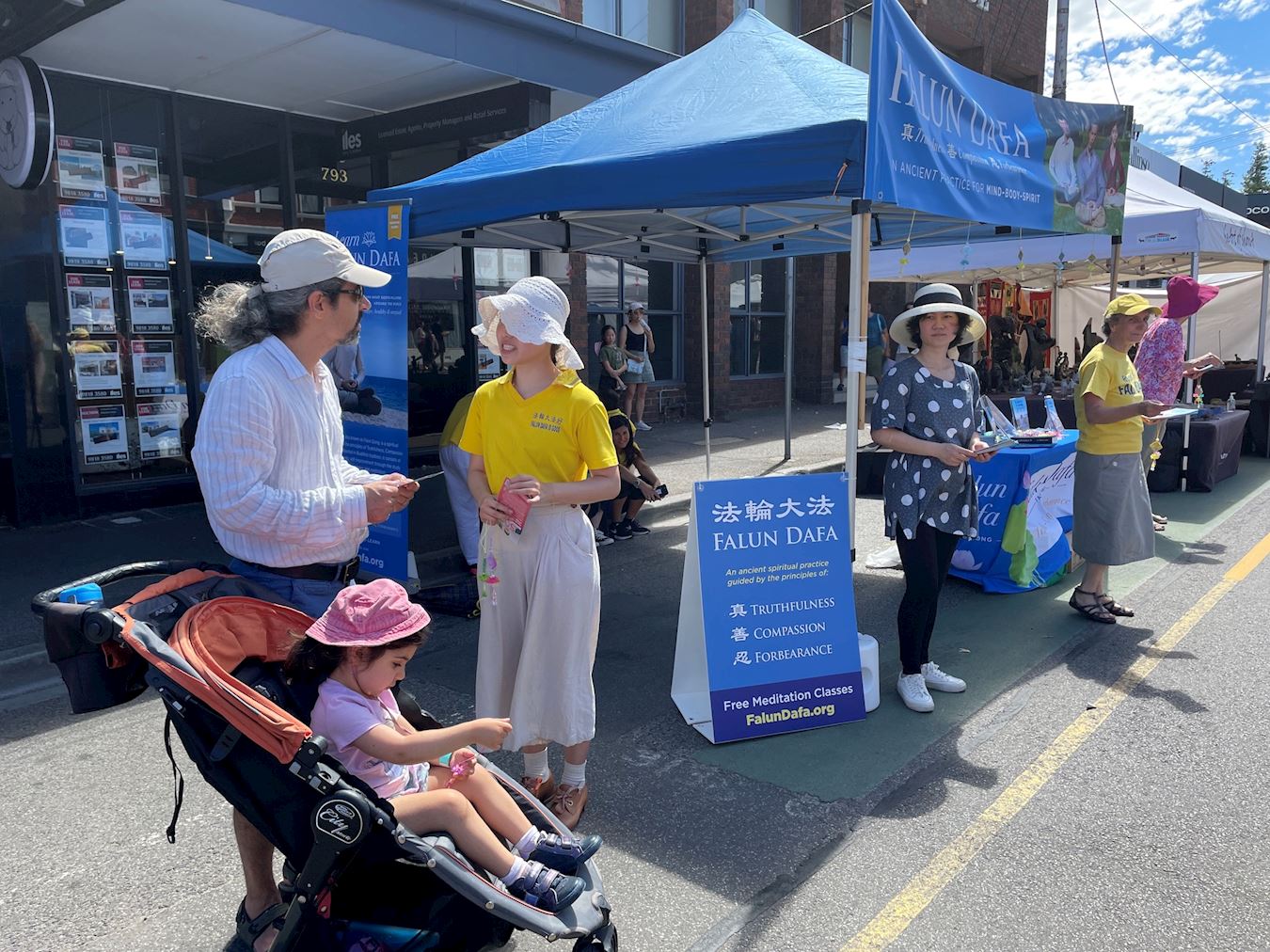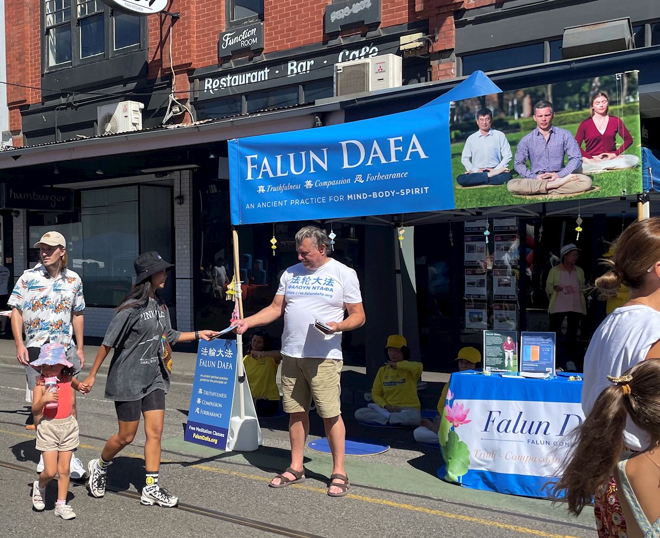 格伦菲里嘉年华是墨尔本最大的地方节庆之一,吸引很多有孩子的家庭前来品尝美食、参加各种娱乐活动等。法轮功学员们历时一天的节庆期间,进行了功法展示,散发了很多传单。不少民众在展位前驻足了解详情,他们来自各族裔、各个年龄段;还有民众在现场学炼功法。