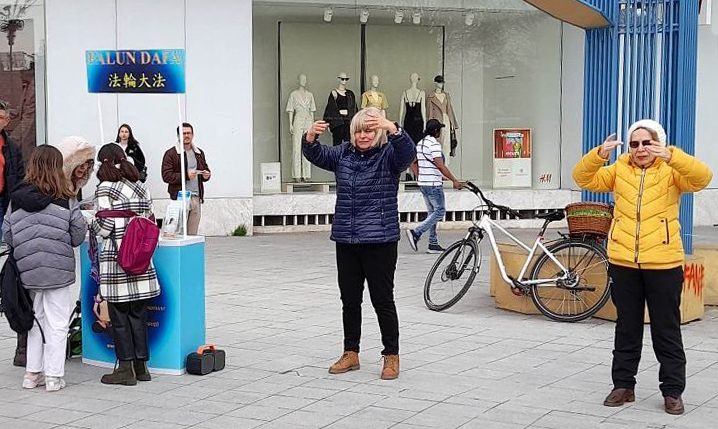 一位头发略白的中年人也来到法轮功学员的真相点。他介绍说他最近在练气功,对法轮功很感兴趣。他提出了一些问题,“炼功是否会影响人的精神状态,是否有助于集中注意力?”在得到满意的答复后,他点头说:“法轮功很好。”
