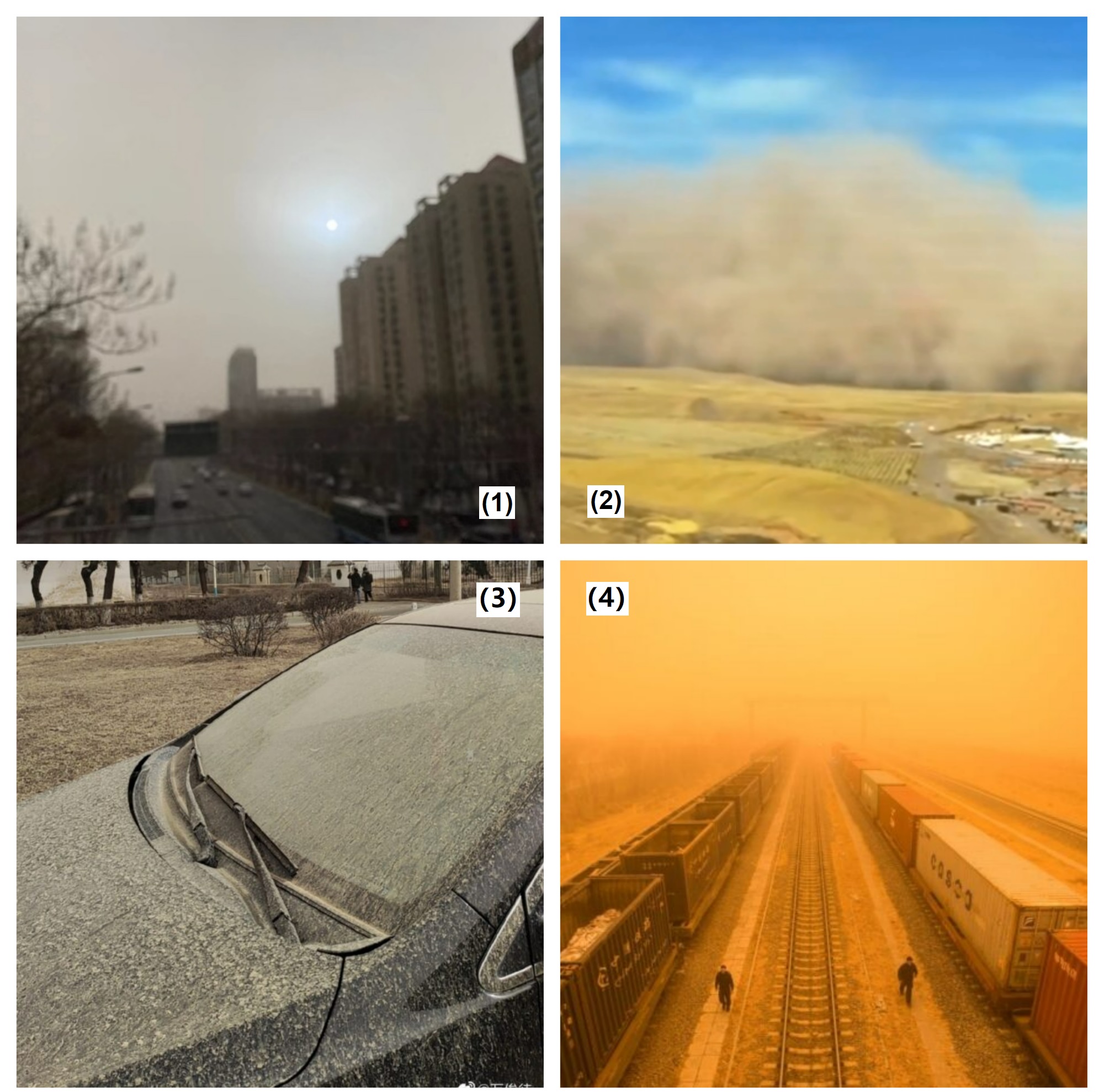 ![]() 图1:上左,二零二三年三月二十二日,因沙尘暴天气,北京天空中的太阳变成了蓝色;上右:三月二十日,甘肃张掖市山丹马场境内遭遇沙尘暴袭击;下左:三月二十二日,长春、沈阳、哈尔滨等地下泥,行人车辆都被浇满泥点;下右:三月二十一日,在中国北部内蒙古地区的边境城市二连浩特,警察在沙尘暴中检查边境检查站的火车车厢。(网络图片合成) |