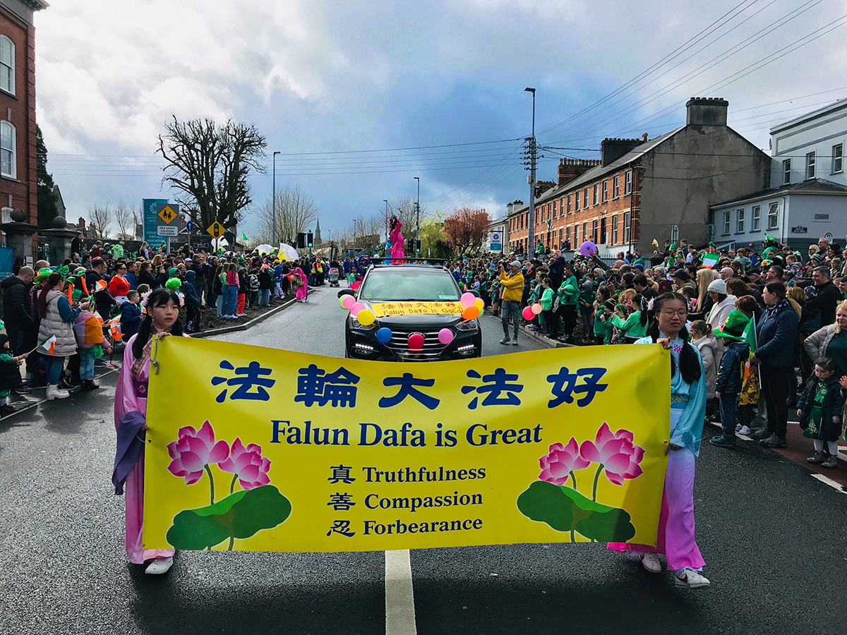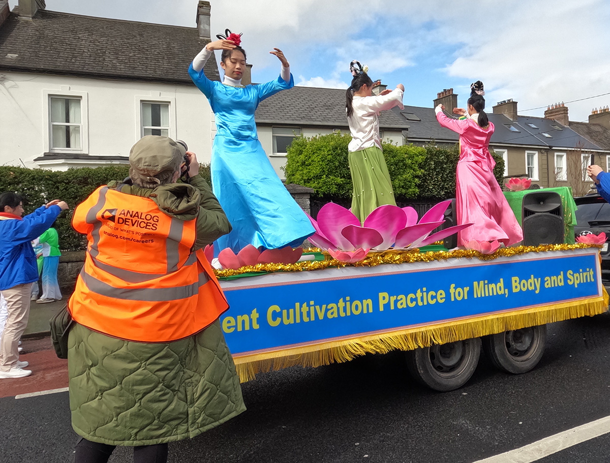 同日,法轮功学员制作的花车首次在爱尔兰西部城市利默瑞克(Limerick)亮相。三位头戴古代配饰、身着明丽色彩盛装的法轮功学员,或坐或立,展示着舒缓祥和的功法动作,为这个西方节日增加了东方传统文化元素,受到主办方和现场观众的盛赞。