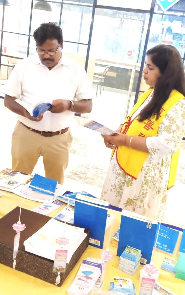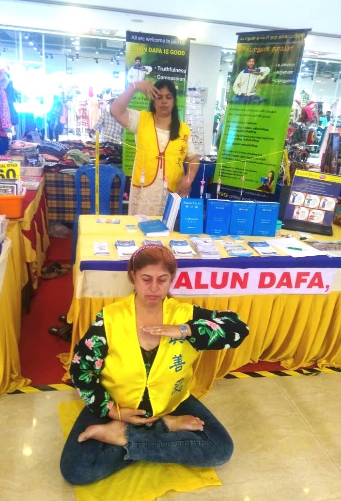 周末两天,购物中心人潮涌动,法轮功学员的展位简单而独特,陈列着英文和泰米尔文的法轮大法书籍,学员们的功法演示吸引了许多民众。有些人问了许多问题,并表示有兴趣了解更多关于法轮大法的信息,还有些人则渴望通过在线课程,学习大法,开始修炼。