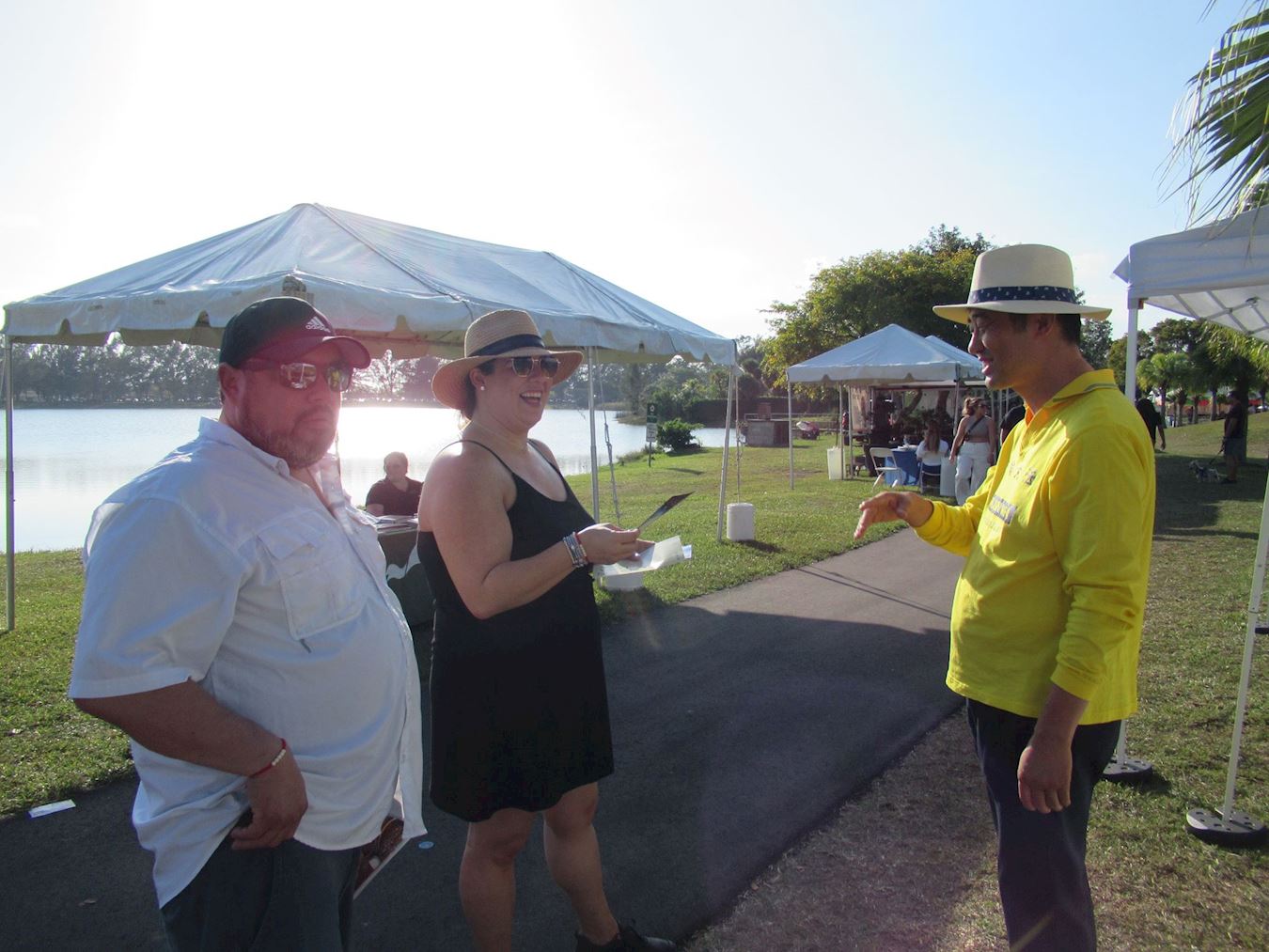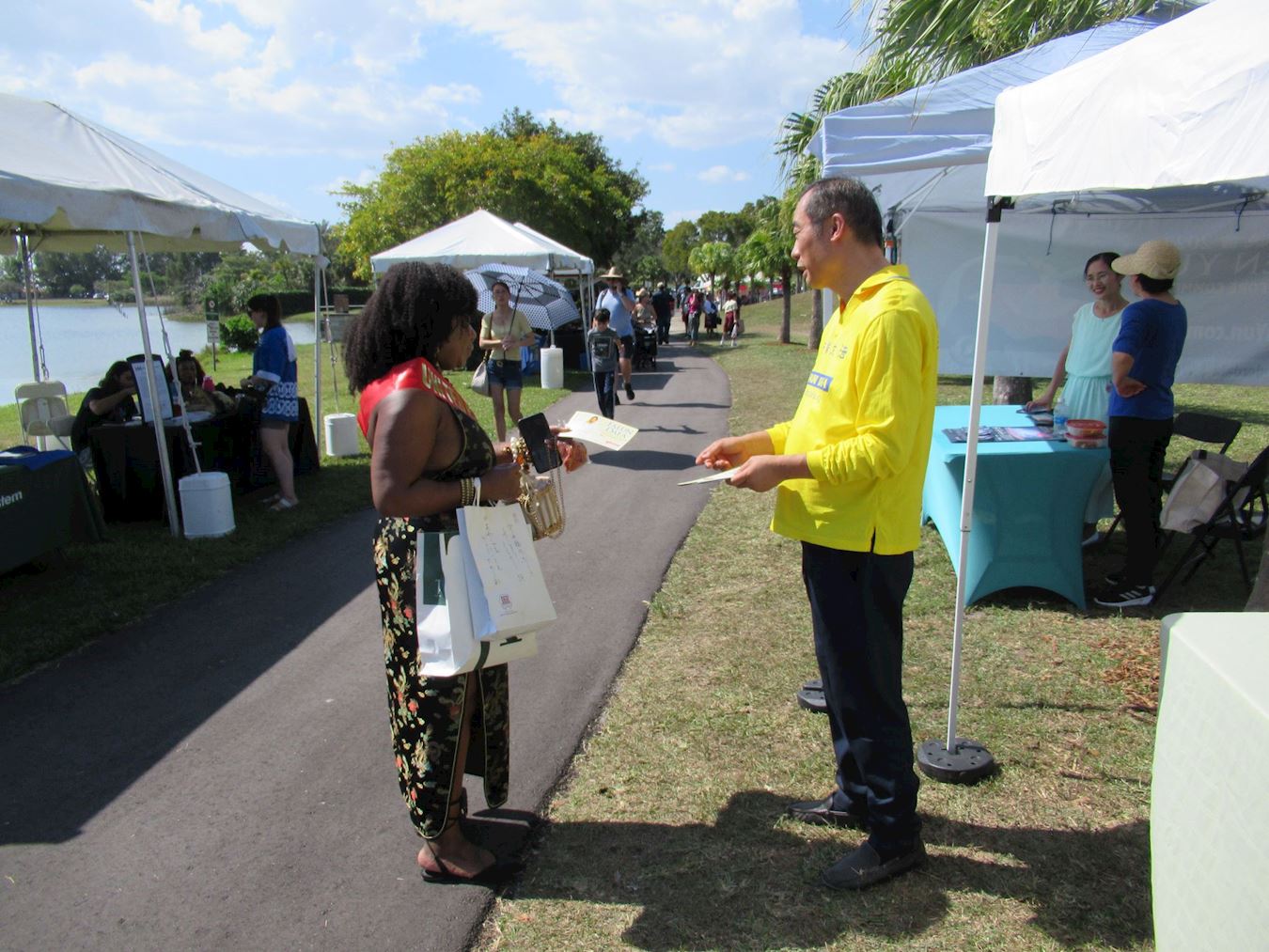 有的游客在看到展位后,主动上来询问:“什么是法轮大法?”并领取了大法资料和莲花挂坠。有游客在听到真相后,感受到了大法的美好和对中共迫害大法的愤慨,并表示会上网了解更多资讯。