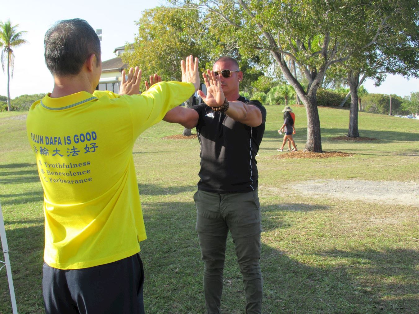 现场学炼法轮功的一位游客,在学会了第一套和第五套功法后,当场表示自己感受到了背部和脊椎的松弛,有很好的效果。并表示会更多了解法轮功。