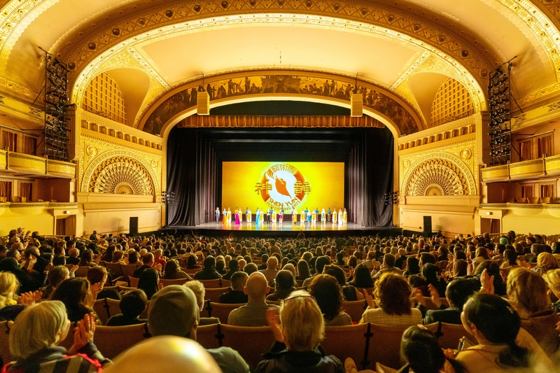![]() 图5:二零二三年四月九日,神韵北美艺术团在美国芝加哥礼堂剧院(Auditorium Theatre)上演的本年度最后一场演出圆满落幕。图为演员谢幕照。(大.纪.元;) |