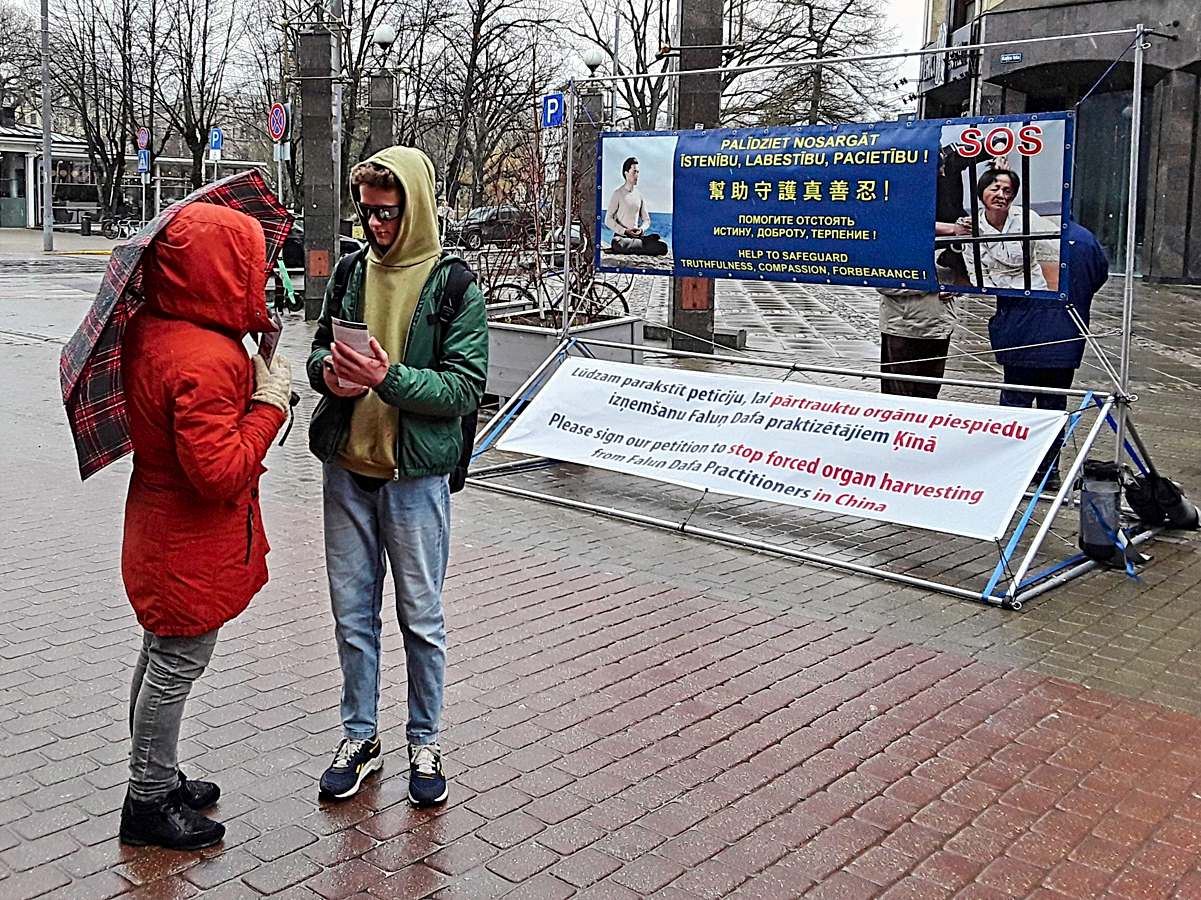 另一位男子说,他已经在库尔迪加(Kuldīga拉脱维亚的另一个城市)签署了请愿书。他对阅读法轮大法的主要书籍《转法轮》产生了兴趣,表示他会去图书馆查阅。