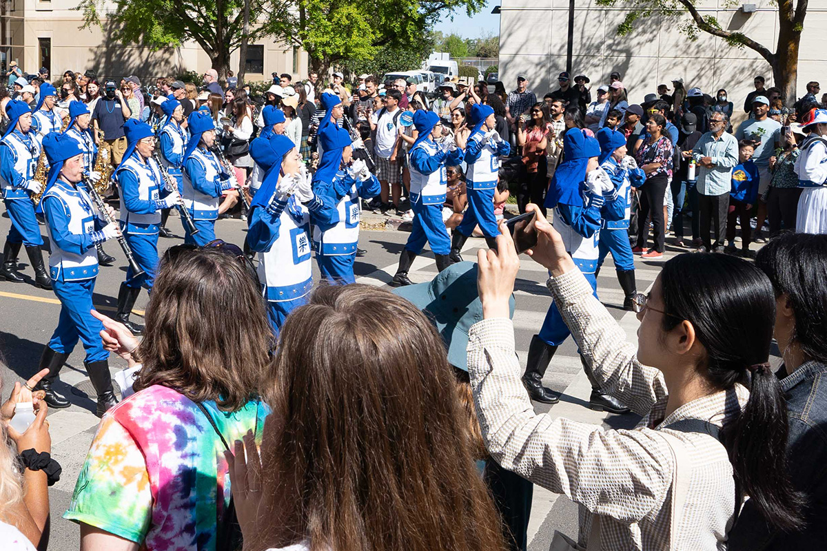 戴维斯大学的学生尼克(Nick)和他的同学们看到法轮功学员的队伍走过来,高兴的挥手欢呼。尼克表示,他在中学时是学校乐队的成员,他说,“所以我知道这个乐团(天国乐团)是很棒的乐团,他们的演奏比戴维斯大学的乐团还要好,我喜欢他们的演奏,乐曲非常好听。他们真的很棒,中音萨克斯管方阵是最棒的。非常感谢。”
