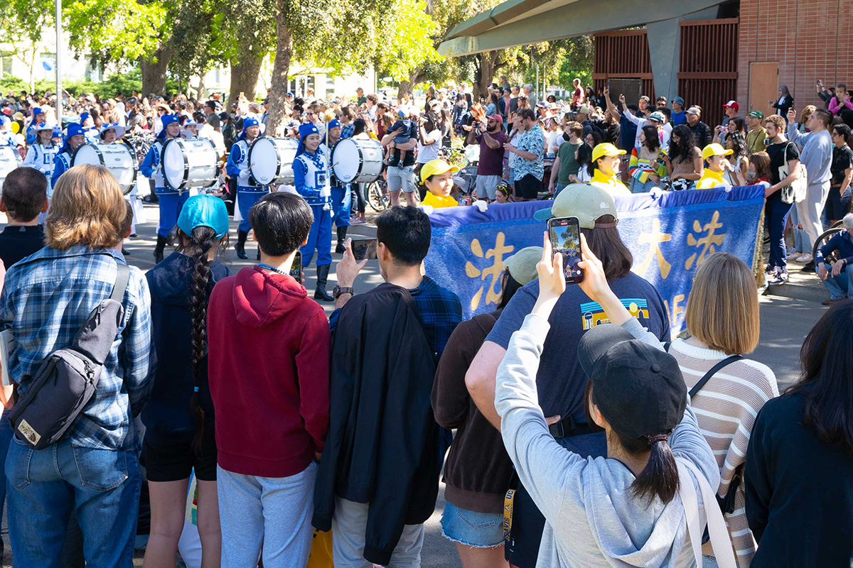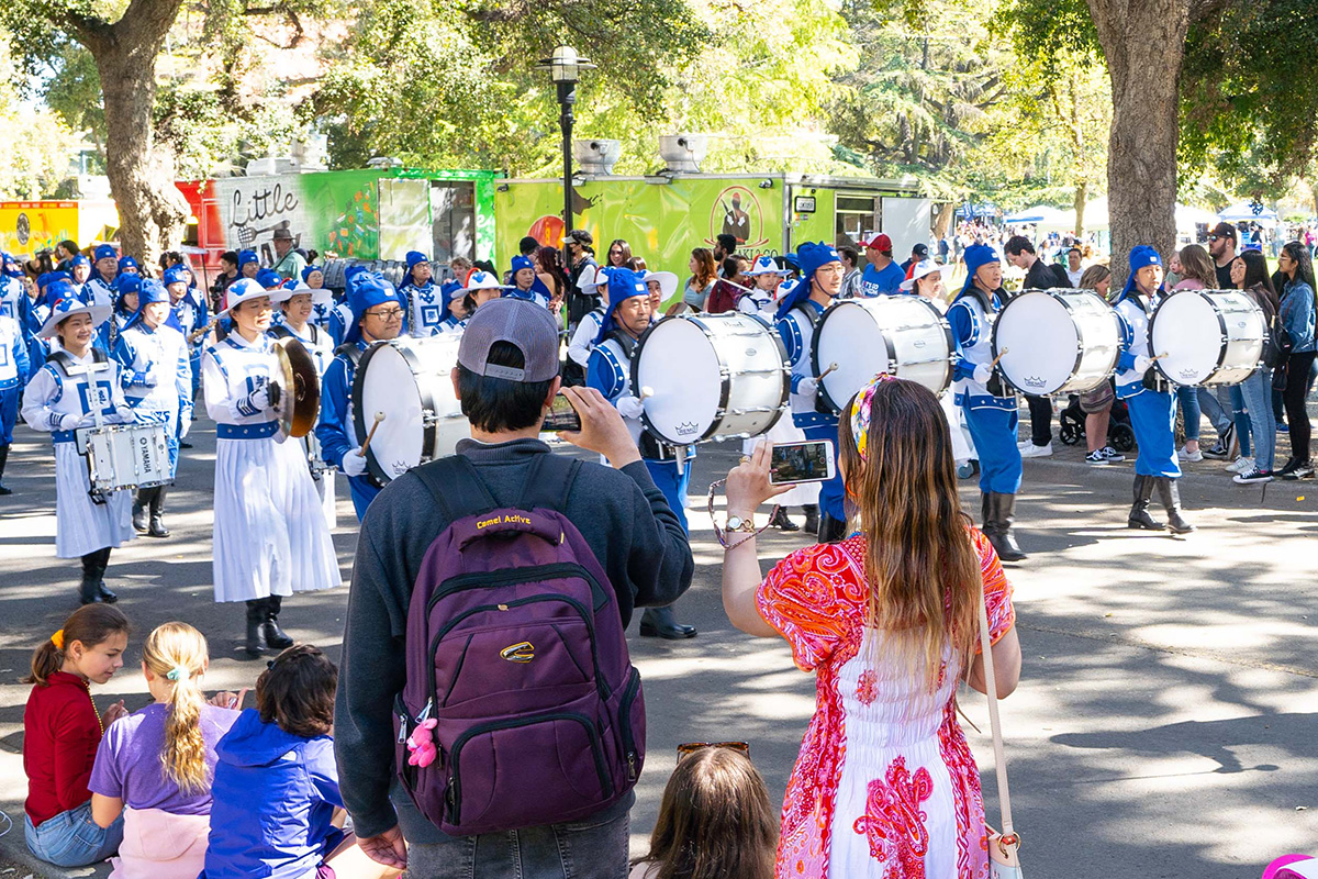 当身着蓝白色古装的法轮大法美西天国乐团出现在游行当中时,格外引人注目,让观众耳目一新,受到热烈的欢迎。他们为观众演奏了《法轮大法好》、《凯旋》和《神圣的歌》等乐曲,受到观众的欢迎。